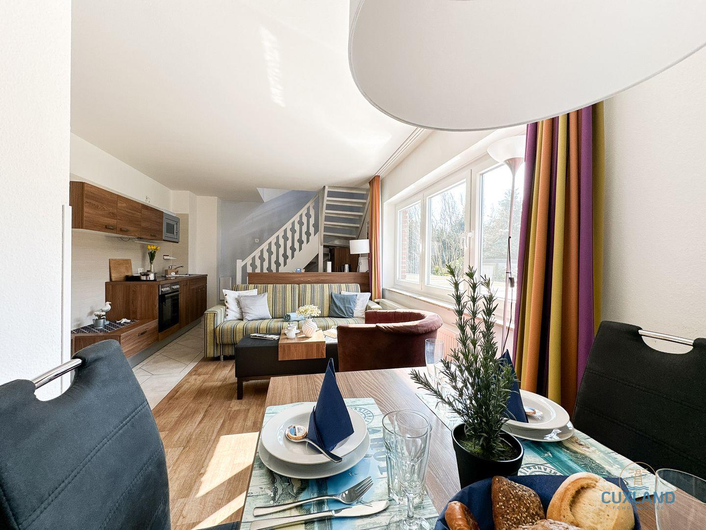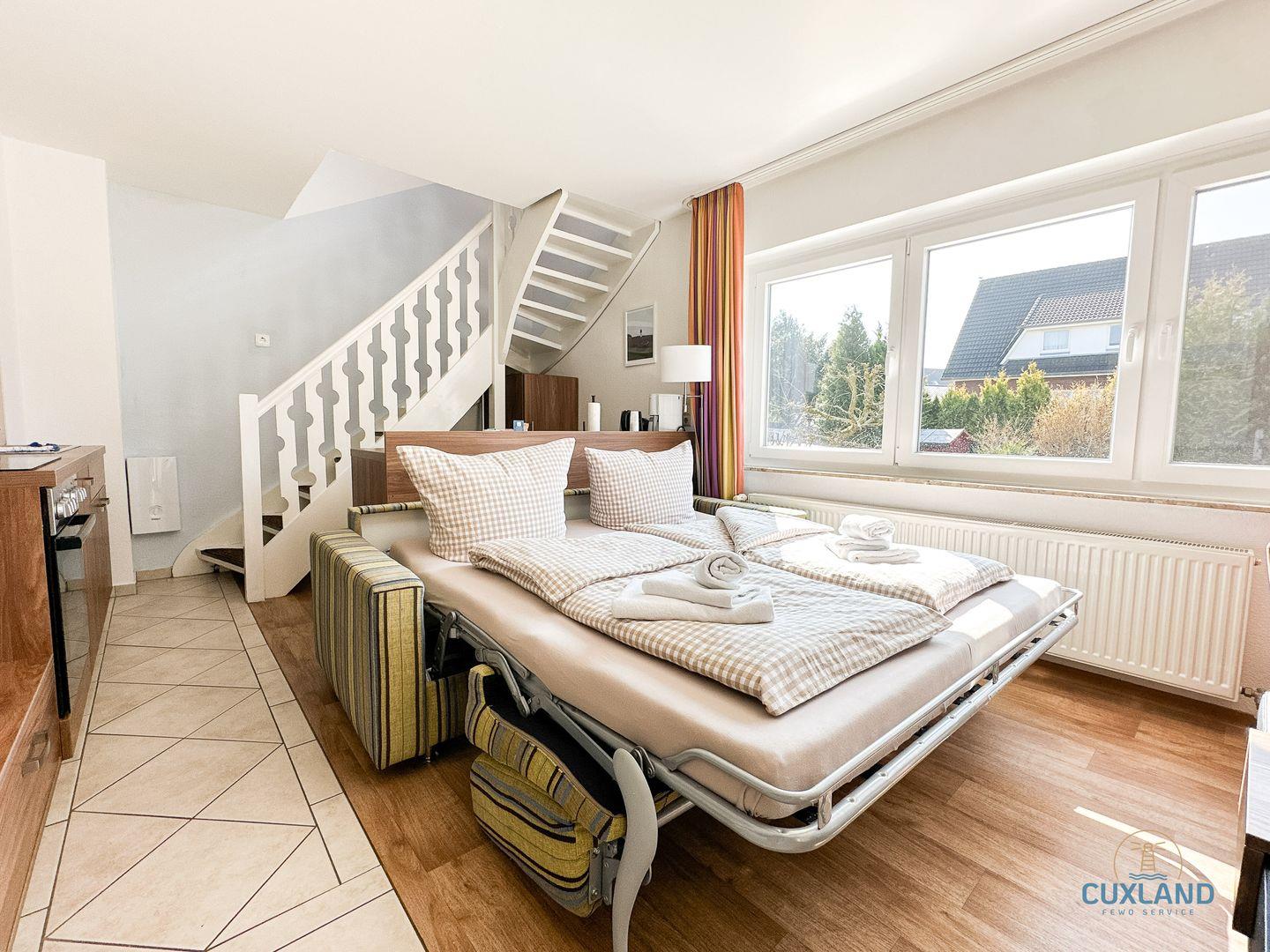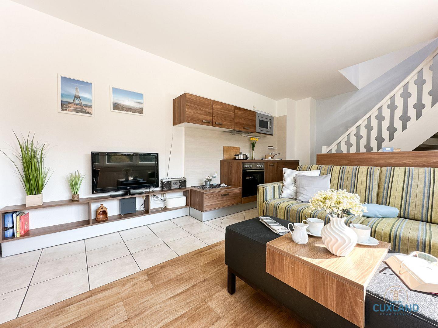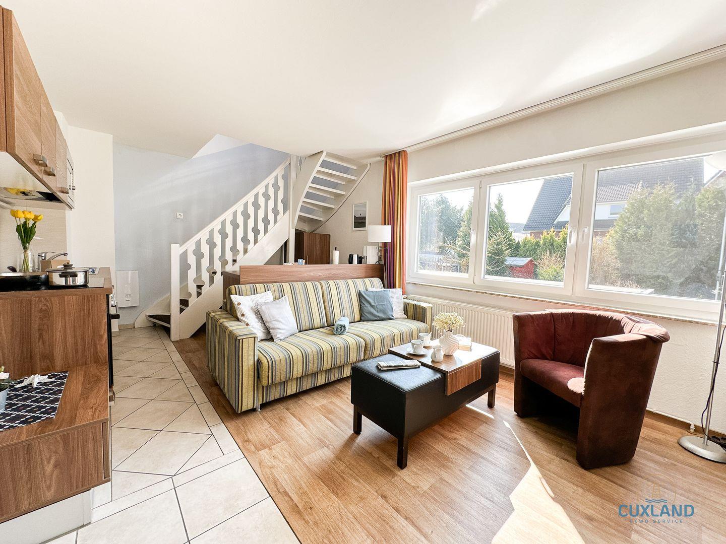 Gemütliche 58qm Wohnung für bis zu 4 Personen in bester Lage von Duhnen. Auf zwei Ebenen: Schlafzimmer mit Doppelbett und Bad oben, offene Küche im unteren Bereich. Wohnbereich mit Schlafcouch und Blick in den ruhigen Garten. Kostenfreies WLAN und eigener PKW-Stellplatz vorhanden.