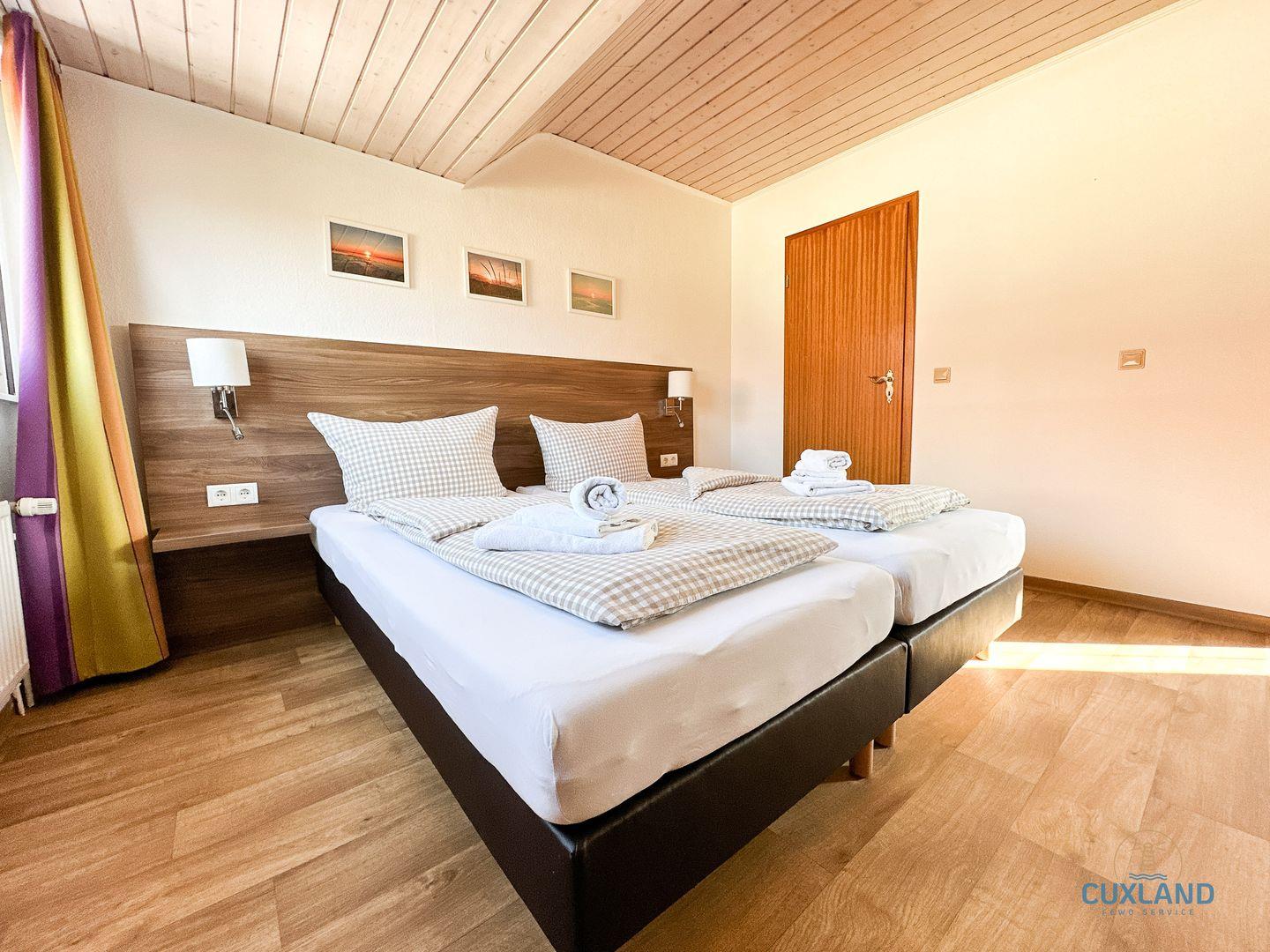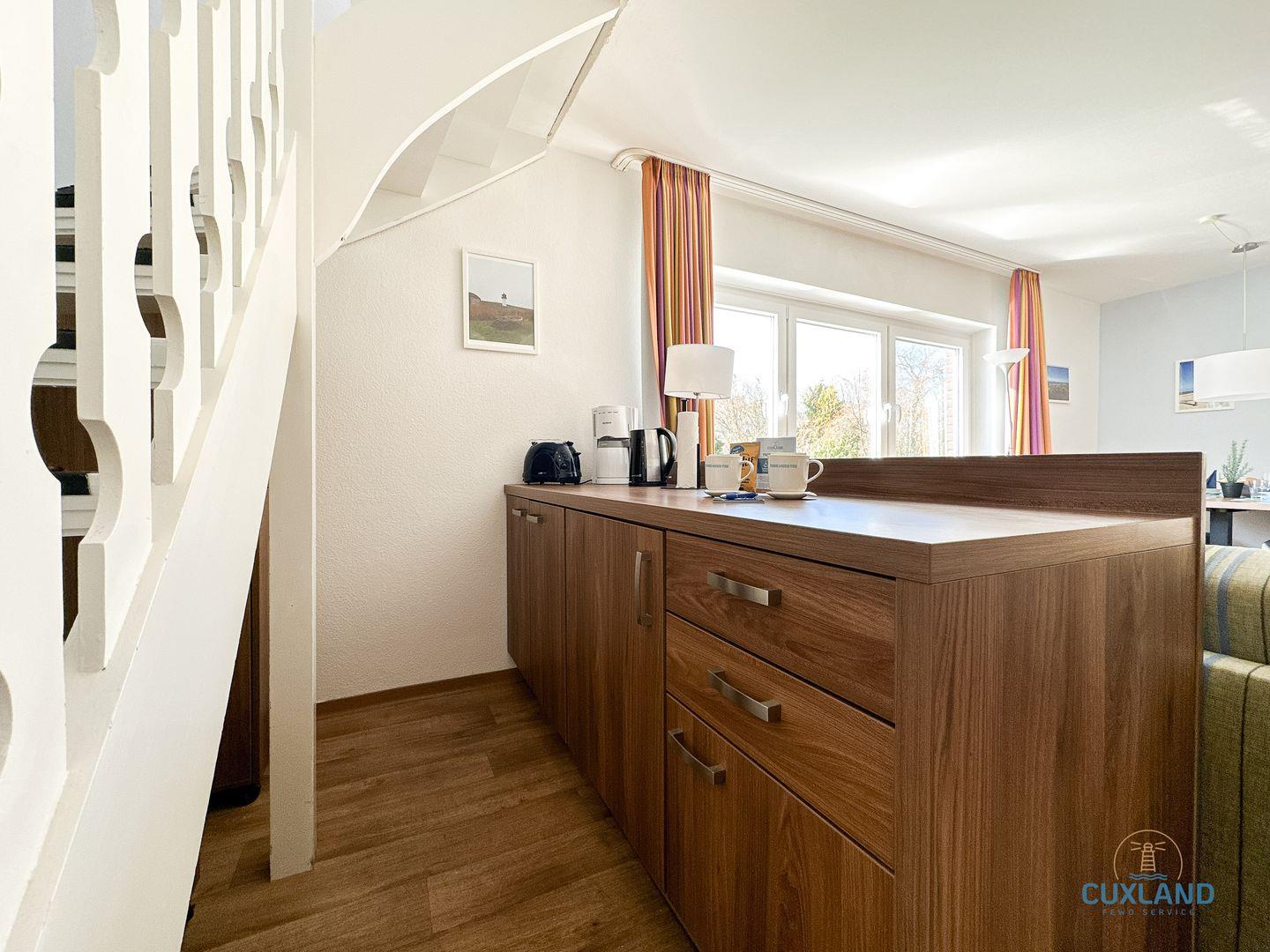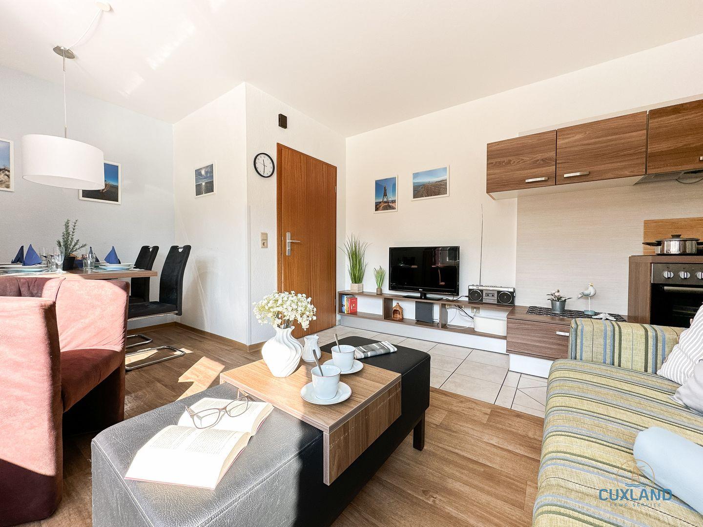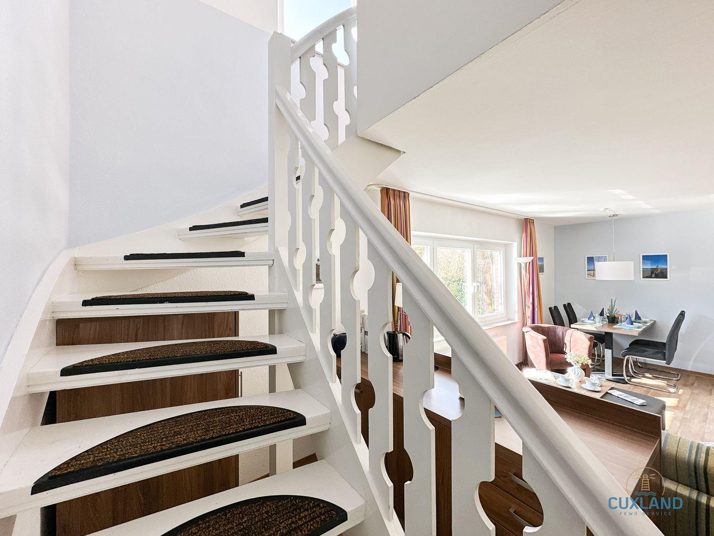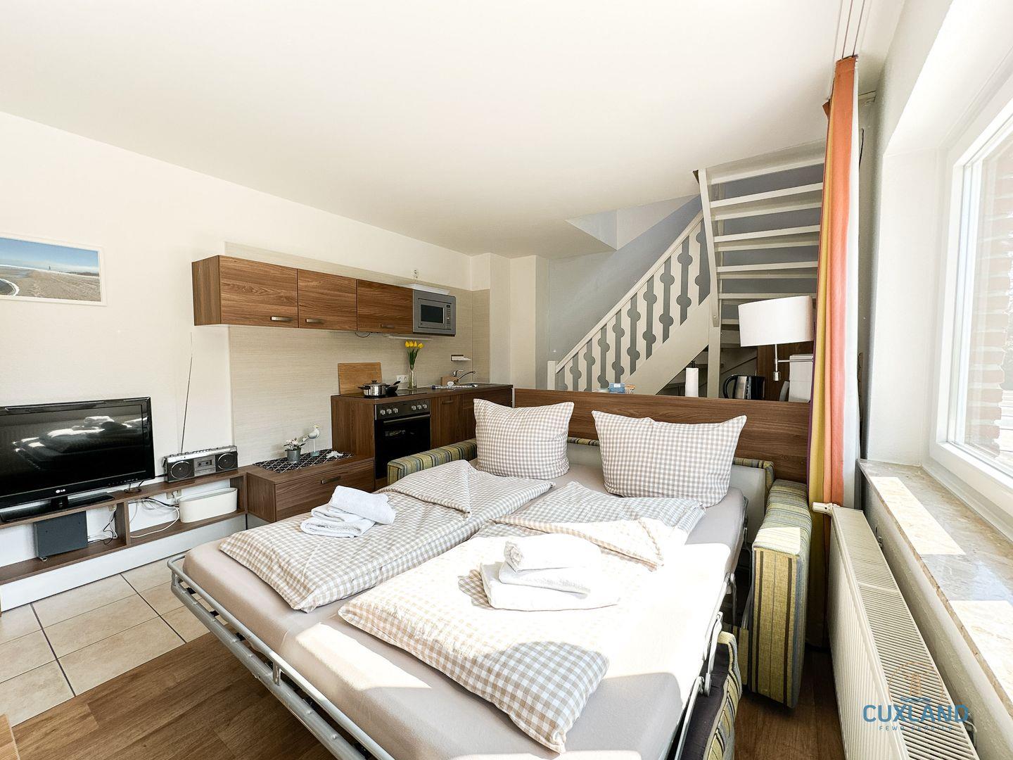 Gemütliche 58qm Wohnung für bis zu 4 Personen in bester Lage von Duhnen. Auf zwei Ebenen: Schlafzimmer mit Doppelbett und Bad oben, offene Küche im unteren Bereich. Wohnbereich mit Schlafcouch und Blick in den ruhigen Garten. Kostenfreies WLAN und eigener PKW-Stellplatz vorhanden.