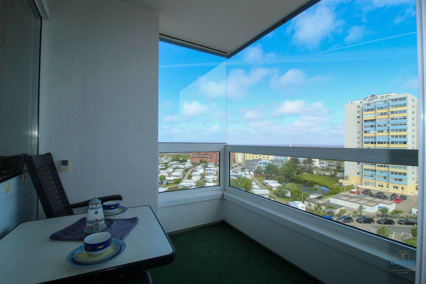 Fenster und vom Balkon aus. Die Wohnung befindet sich in der 8. Etage und