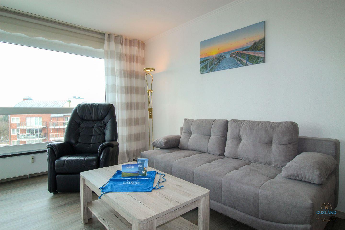Das 42qm Apartment im Haus Frische Brise bietet alles für einen entspannten Urlaub zu dritt. Das Schlafzimmer verfügt über ein gemütliches Doppelbett, während die dritte Person auf der Schlafcouch im Wohnzimmer unterkommt. Die Bodentiefen Fenster und der Balkon gewähren eine großartige Aussicht auf das Wattenmeer und die Insel Neuwerk. Die 8. Etage-Wohnung bietet kostenloses WLAN und einen Parkplatz.
