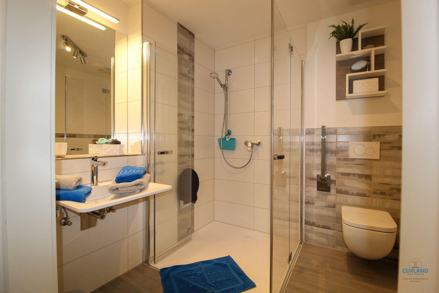 ausgestattet (unterfahrbarer Waschtisch, extra große Dusche mit Sitz, WC mit