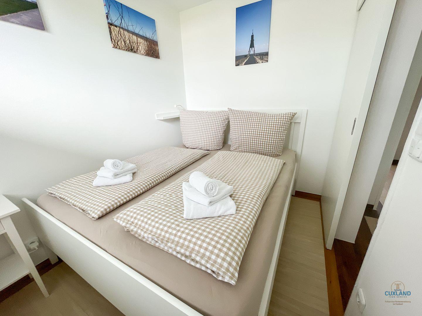 ein Schlafzimmer mit einem Doppelbett (160x200) und einen eigenen PKW-Stellplatz