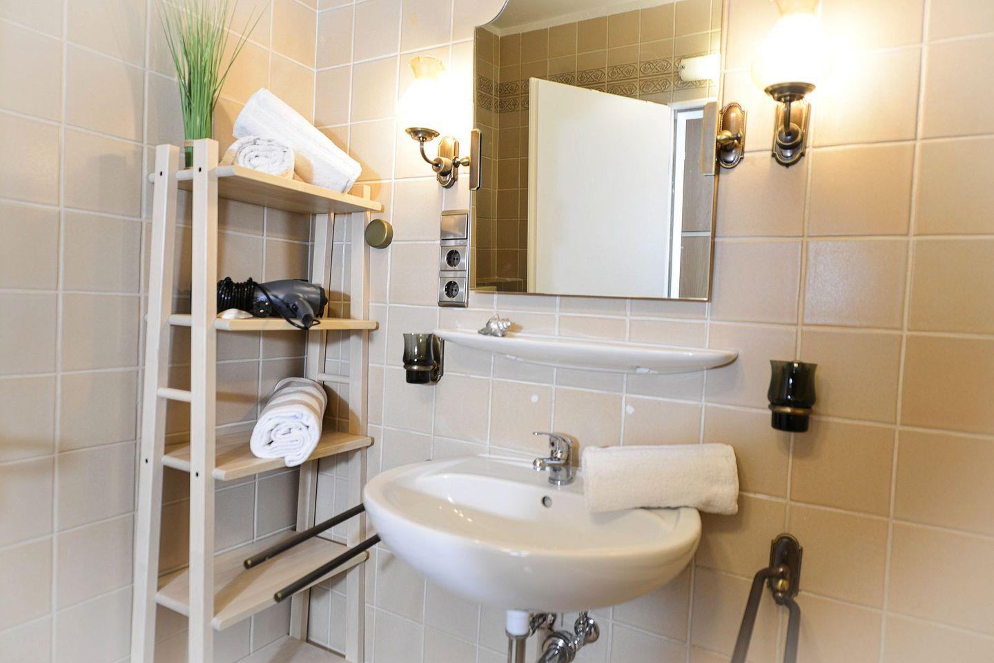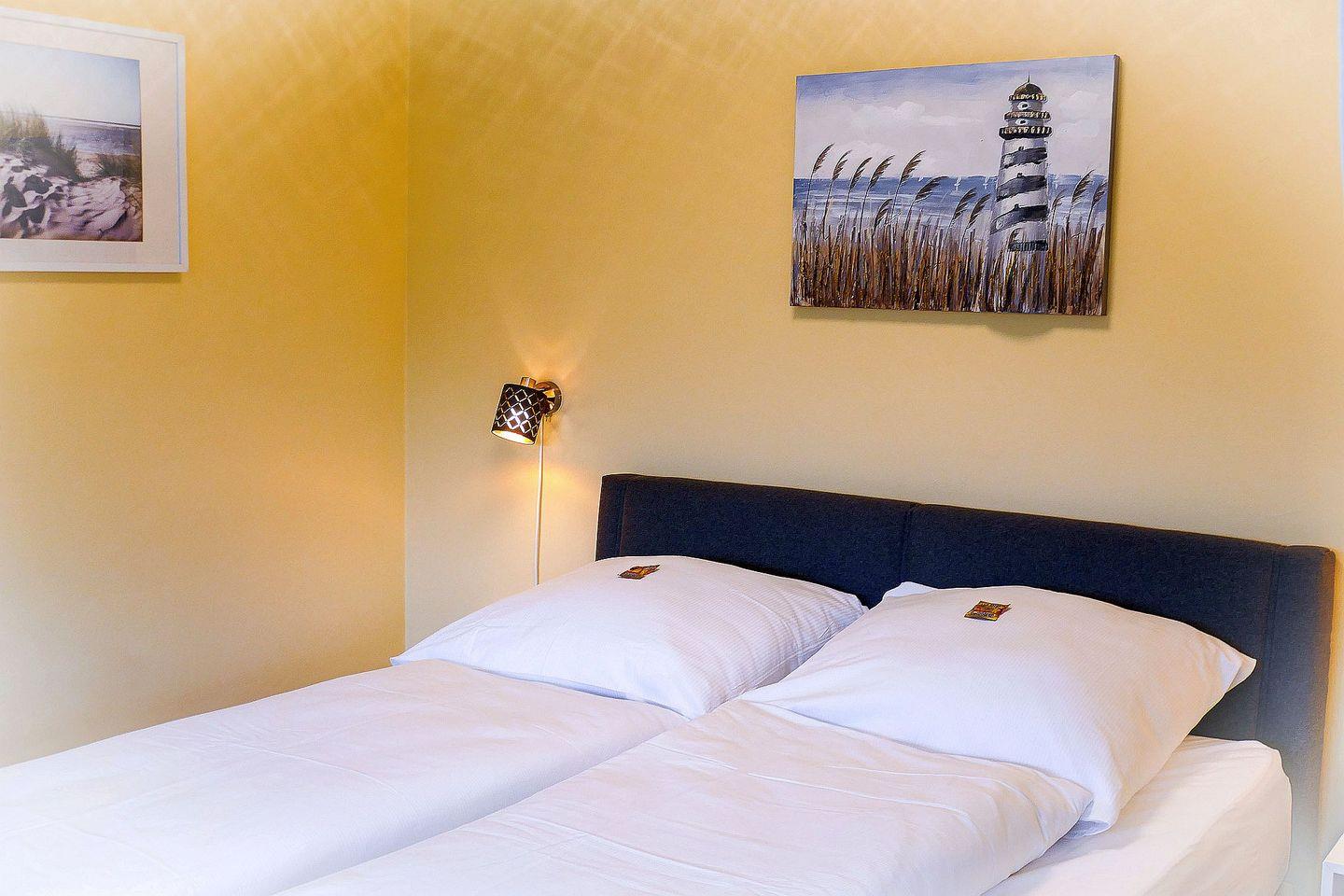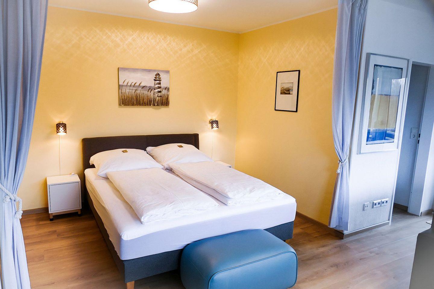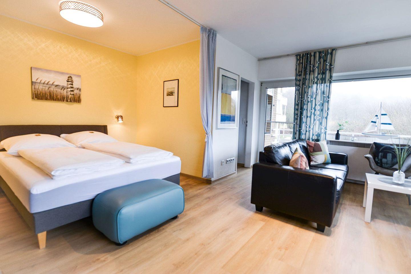 Die Einrichtung ist modern und zeitgemäß, und wird durch ein neuens Boxspringbett im Wohnraum ergänzt.