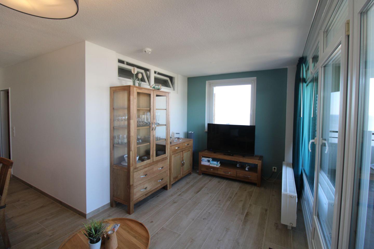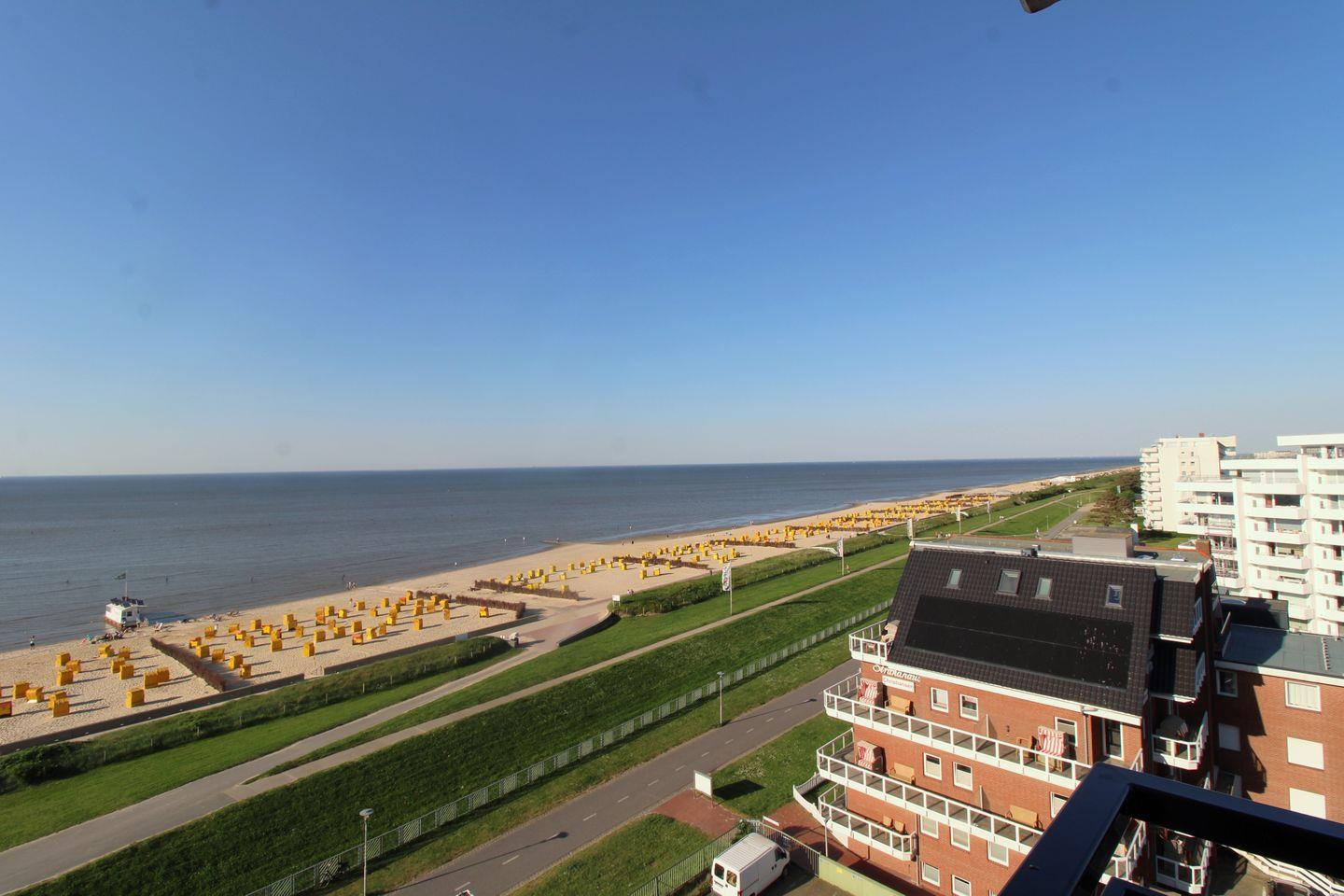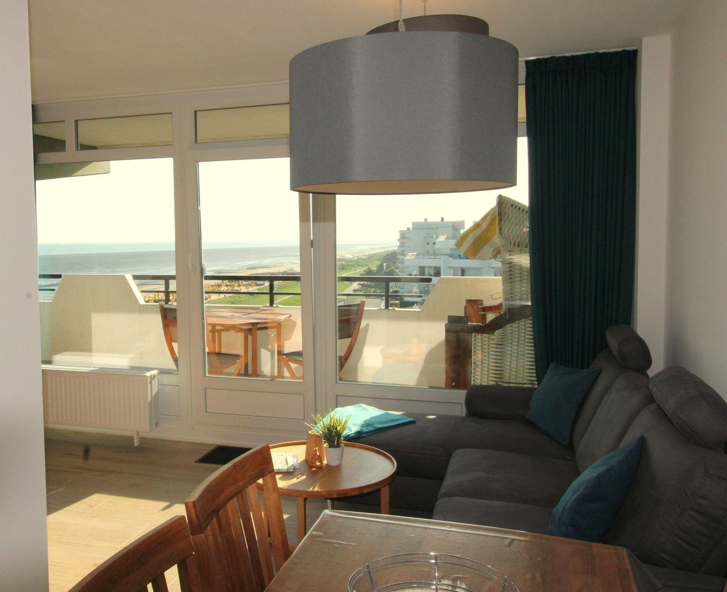 Die modern und hochwertig eingerichtete Ferienwohnung Nr. 101 (ca. 44 m²) wurde Anfang 2024 kernsaniert und befindet sich im 7. Obergeschoss. Von hier genießen Sie einen hervorragenden Seeblick über die Elbmündung bis nach Schleswig-Holstein – ein besonderes Highlight, das Sie sogar vom Sofa aus durch das seitliche Fenster erleben können.