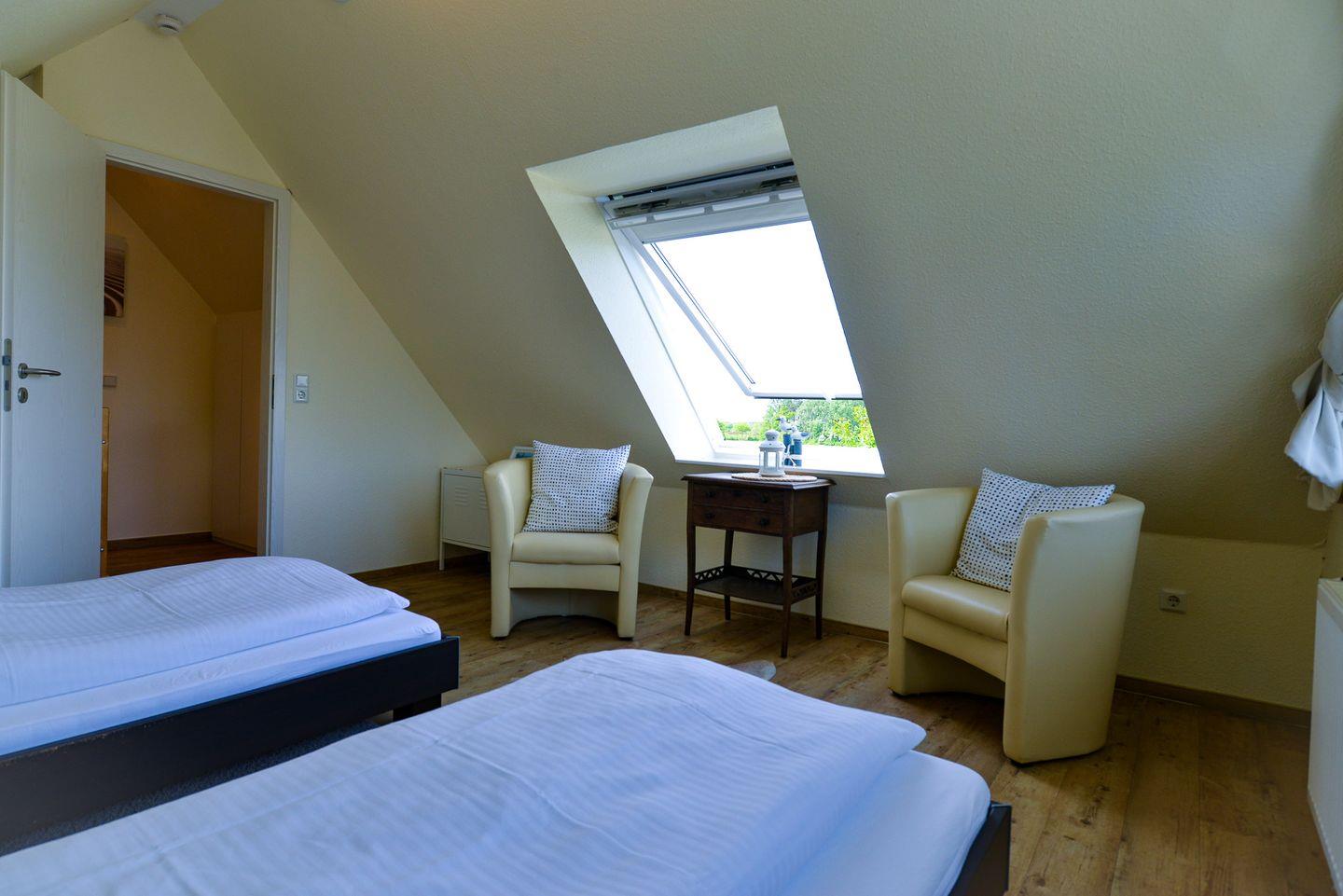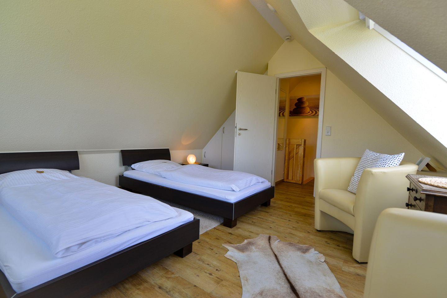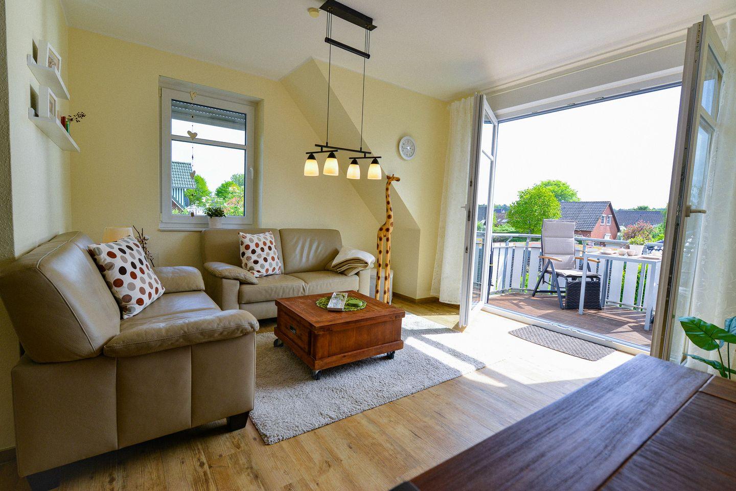 Auf ca. 58m² finden Nordseeurlauber mehr als genug Raum, um sich in der modernen und hochwertigen Einrichtung dieser Ferienwohnung wohlzufühlen, die Ihnen einen Urlaub ohne Alltagsstress und Abstriche ermöglicht. Die vollausgestattete Küchenzeile, wie auch das große Bad mit eigener Waschmaschine in Kombination Trockner sorgen für Wohlgefühl und Erholung in Ihrer Ferienwohnung. Urlauber, die gerne entspannt den Tag ausklingen lassen oder mit einem schönen Frühstück den Tag einleiten möchten, genießen schöne Stunden auf dem Südbalkon mit Blick ins Grüne. Aus dem oberen Schlafzimmer und dem Bad bietet sich ein malerischer Blick auf die Pferdewiesen. Im Wohnzimmer befindet sich das TV und kostenfreies WLAN sowie ein kostenfreier Parkplatz stehen Ihnen zur Verfügung. Die Wohnung ist haustierfrei, was für Allergiker ideal ist.