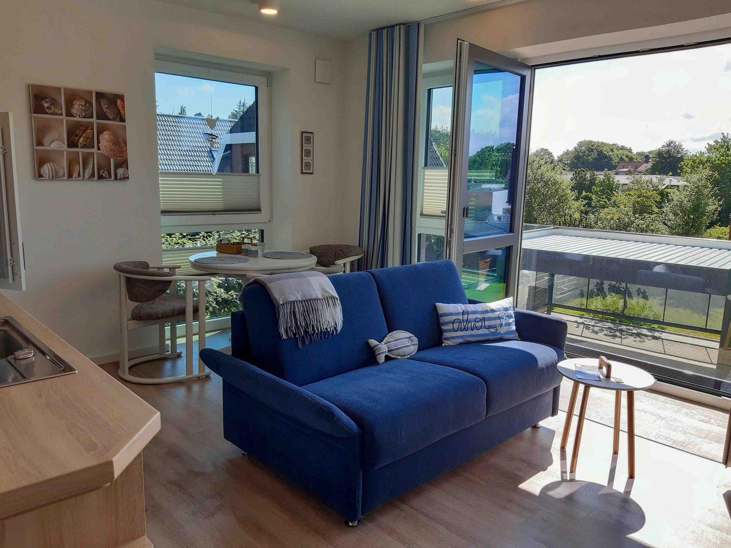 Unsere 51 qm große Ferienwohnung in Südlage liegt im 2021 erbauten "Haus Meerdüne" mit ruhigem Garten. Die Wohnung im 1. Stock umfasst Flur, Schlafzimmer, Wohnzimmer mit Küche und ein behindertengerechtes Duschbad. Die moderne Einrichtung spiegelt das schiffsähnliche Äußere wider. Eine breite Eingangstür und ein Fahrstuhl sorgen für Barrierefreiheit. Fitnessbereich, Sauna und Fahrradverleih bieten Entspannung bei jedem Wetter. Eine Wallbox (11 KW) für Elektro-Pkws ist verfügbar.