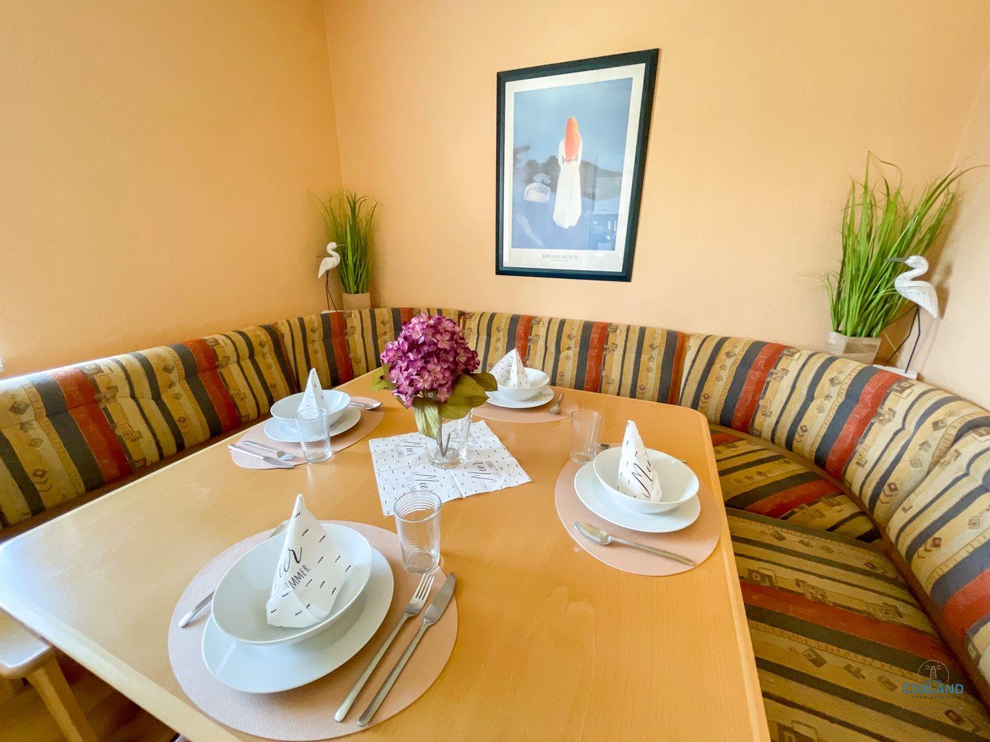 bietet euch mit Ihren zwei großen Schlafzimmern, Platz für bis zu 5 Personen. Die zwei Highlights dieser großzügigen Unterkunft sind mit Sicherheit zum einen die zwei Balkone von denen einer über das Wohnzimmer zu erreichen ist. Der zweite gehört zum Schlafzimmer im oberen Stockwerk. Das zweite Highlight ist der grosszügige Essbereich mit Eckbank und großem Esstisch, welcher direkt an die Küche grenzt. Hier lässt es sich ausgiebig mit der ganzen Familie Speisen oder es können auch gemütliche Spieleabende stattfinden. Zwei Bäder mit jeweils einer Dusche und eines davon mit Waschmaschine runden das Angebot dieser Wohnung ab. W-LAN und ein eigener Tiefgaragenparkplatz sind ebenfalls inklusive. Perfekt für einen erholsamen Familienurlaub.