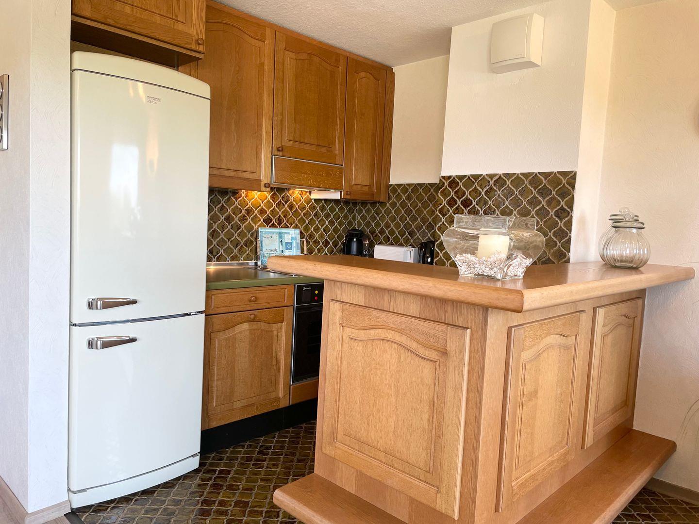 Im Wohnraum erwartet Sie eine offene Küche mit Tresen, die ideal ist, um gemeinsam zu kochen und zu schlemmen. Die beiden gemütlichen Sofas bieten ausreichend Platz, um sich nach einem erlebnisreichen Tag zurückzulehnen und zu entspannen.