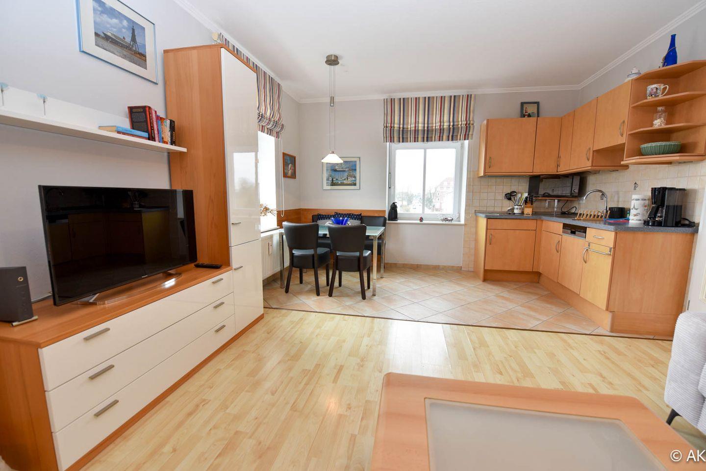 Die Küchenzeile ist praktisch in den Wohnbereich integriert und mit allem ausgestattet, was Sie für die Zubereitung Ihrer Mahlzeiten benötigen. Ein Geschirrspüler sorgt dafür, dass Sie Ihren Urlaub in vollen Zügen genießen können, ohne sich um den Abwasch zu kümmern.