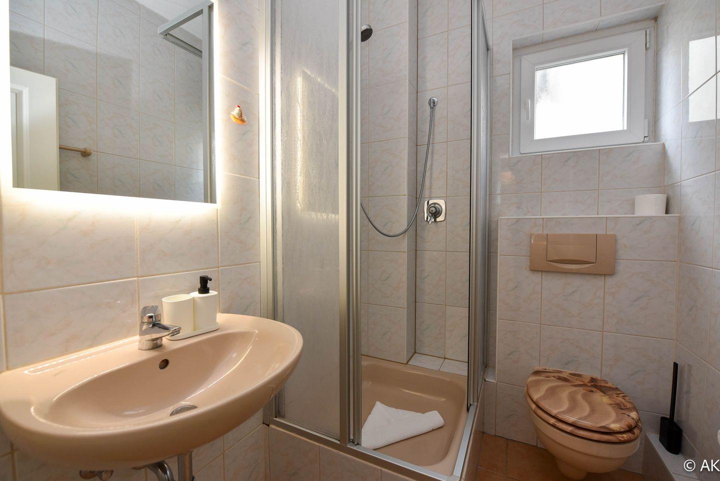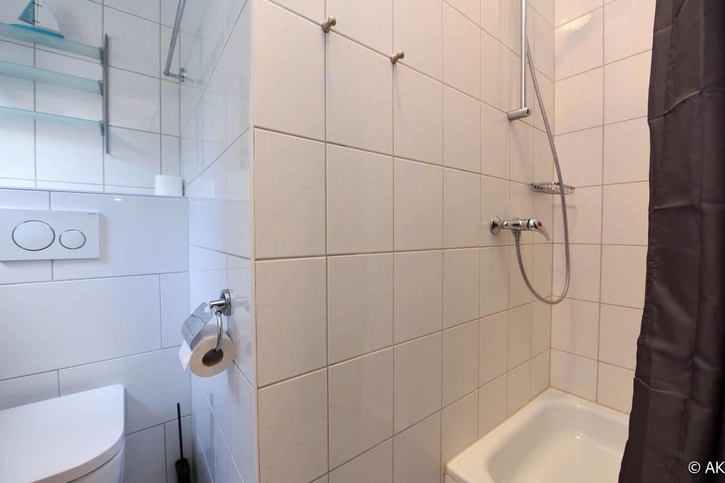 Das zweite Badezimmer, das vom Flur abgeht, ist ebenfalls mit einer Dusche und einem WC ausgestattet, was besonders bei der Nutzung durch mehrere Personen für zusätzlichen Komfort sorgt.