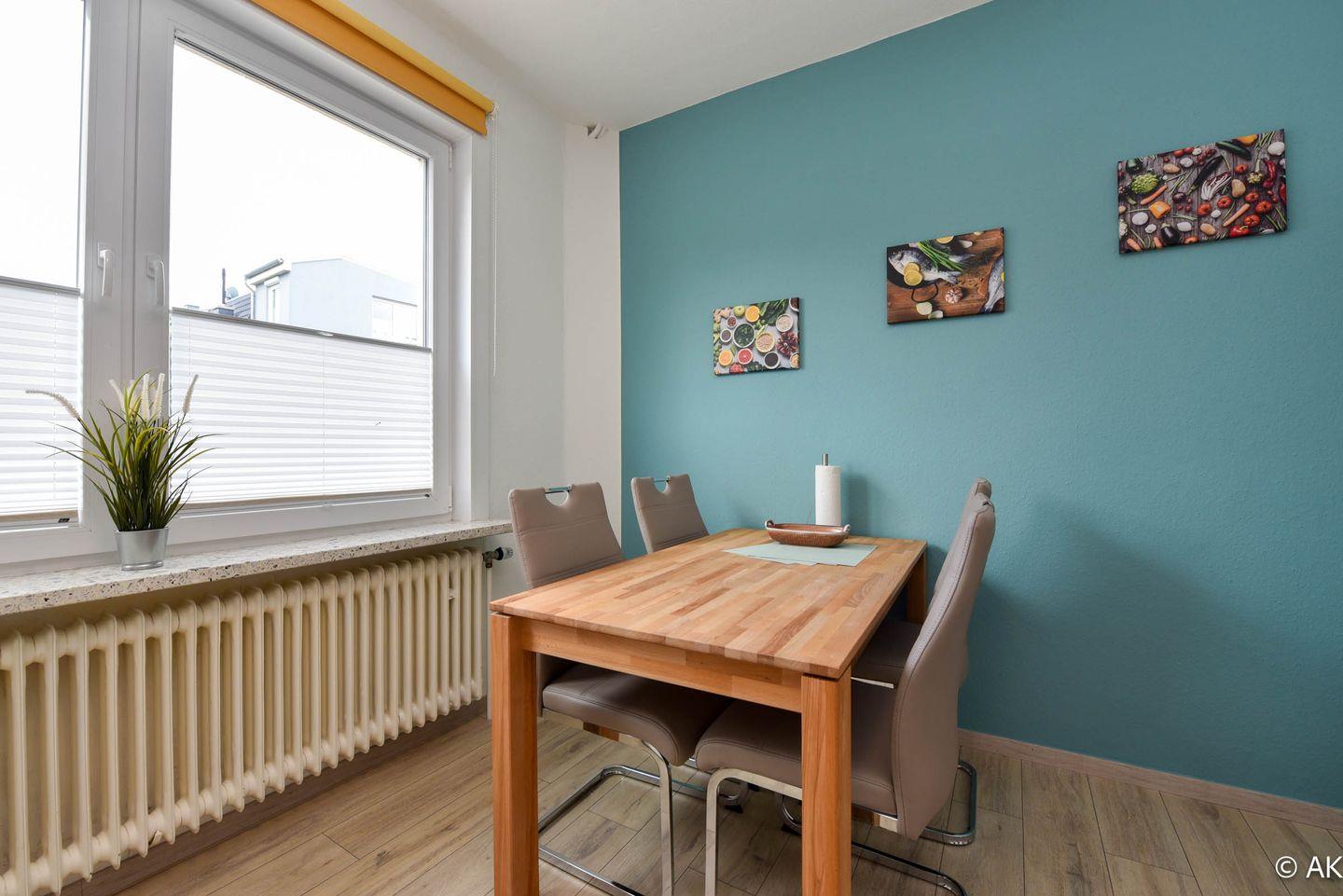 Der Mittelpunkt der Wohnung ist die große Wohnküche mit einer voll ausgestatteten Küchenzeile inklusive Backofen, Geschirrspüler und Mikrowelle. Der Esstisch für vier Personen lädt nicht nur zu gemeinsamen Mahlzeiten, sondern auch zu gemütlichen Spieleabenden ein.