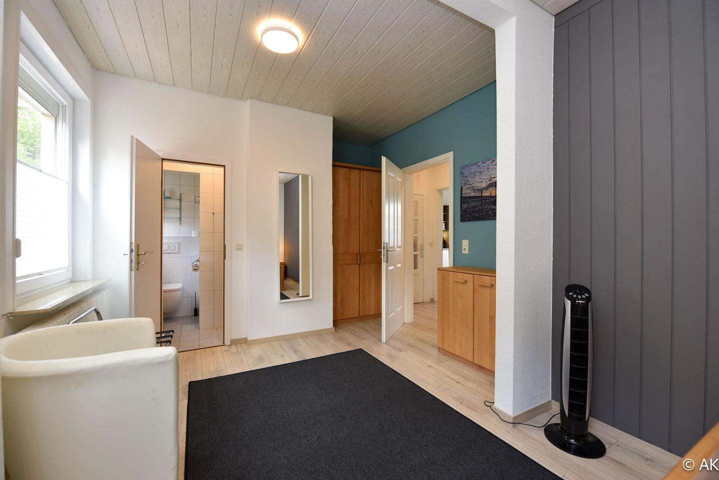Beim Betreten der Wohnung empfängt Sie ein geräumiger Flur mit praktischer Garderobe, die ausreichend Platz für Jacken, Schuhe und Reisegepäck bietet. Von hier aus gelangen Sie in die verschiedenen Wohnbereiche.