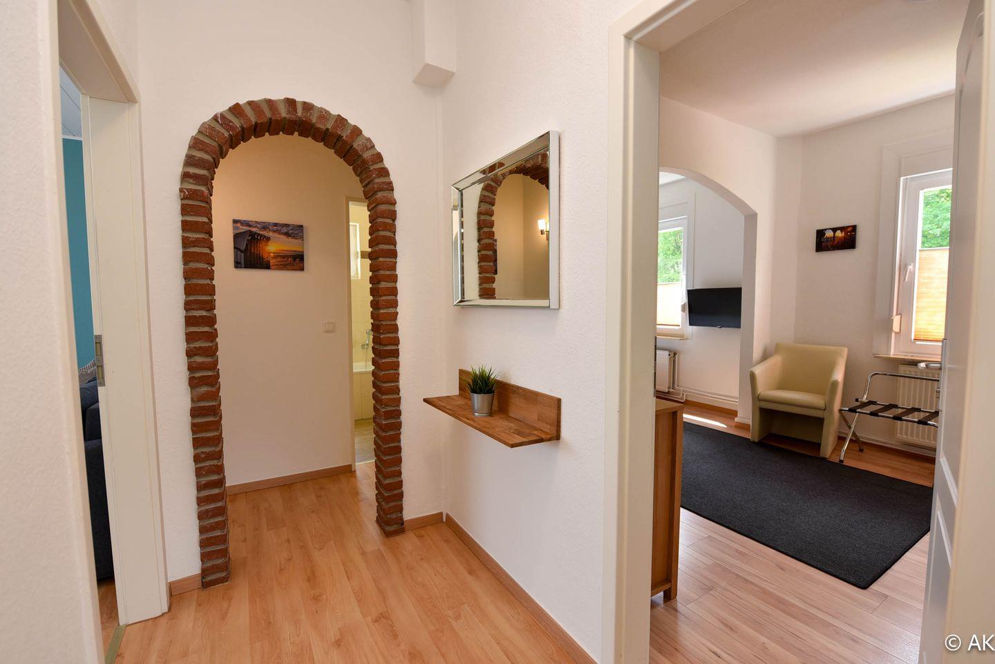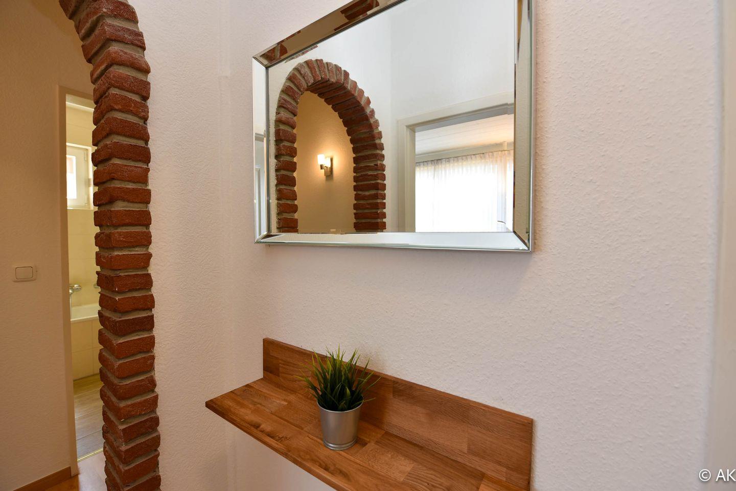 Der Eingangsbereich empfängt Sie mit einem geräumigen Flur, der mit einer praktischen Garderobe ausgestattet ist und ausreichend Platz für Jacken, Schuhe und Reisegepäck bietet.