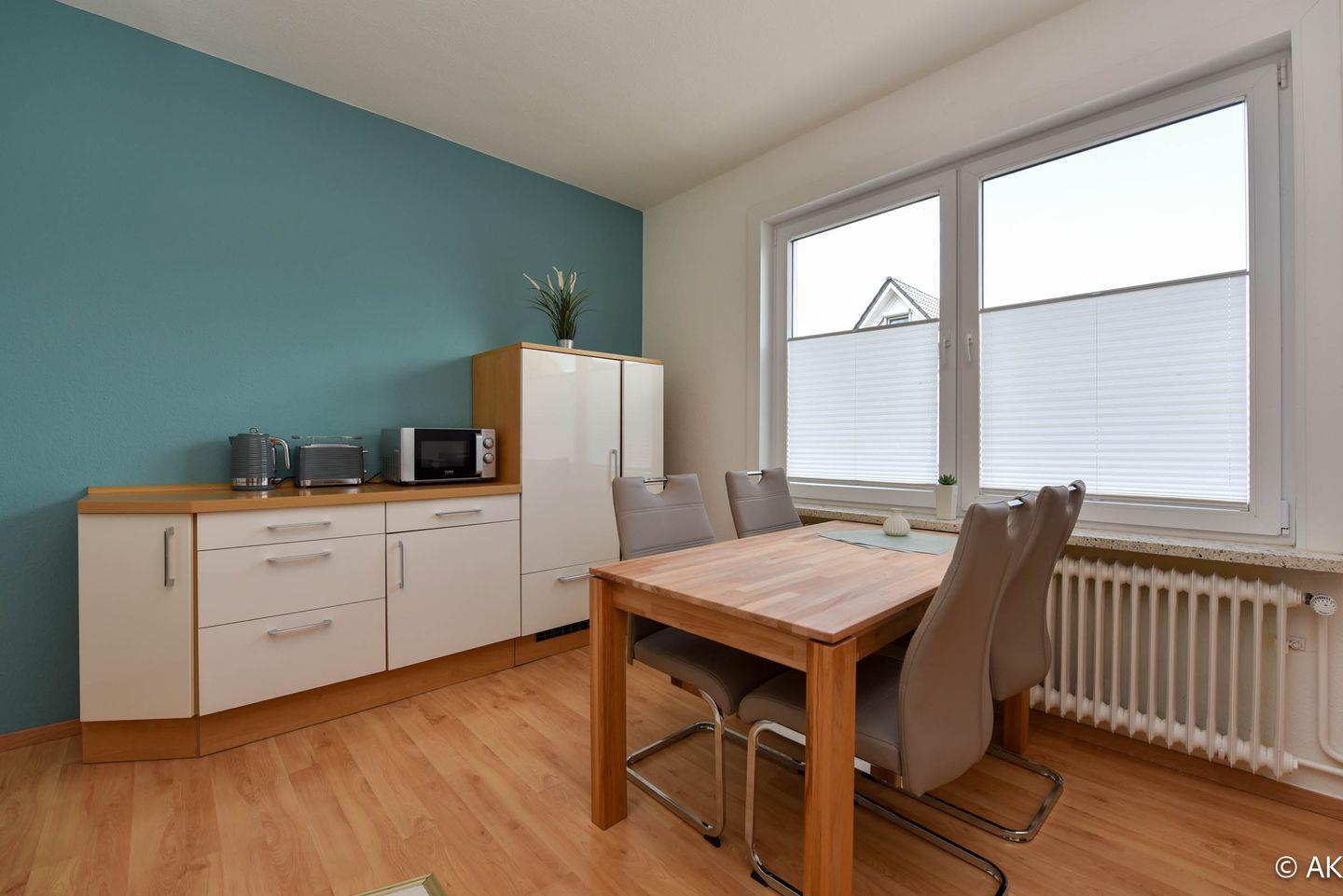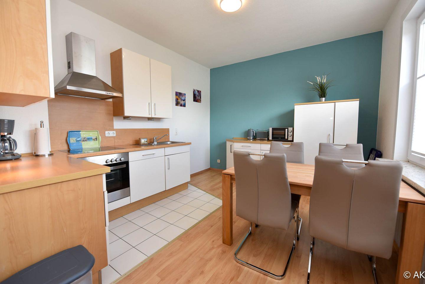 Die geräumige Wohnküche bildet das Herzstück der Wohnung. Sie ist mit einer voll ausgestatteten Küchenzeile inklusive Backofen, Geschirrspüler und Mikrowelle versehen. Der Esstisch für vier Personen lädt nicht nur zu gemeinsamen Mahlzeiten, sondern auch zu geselligen Spieleabenden ein.