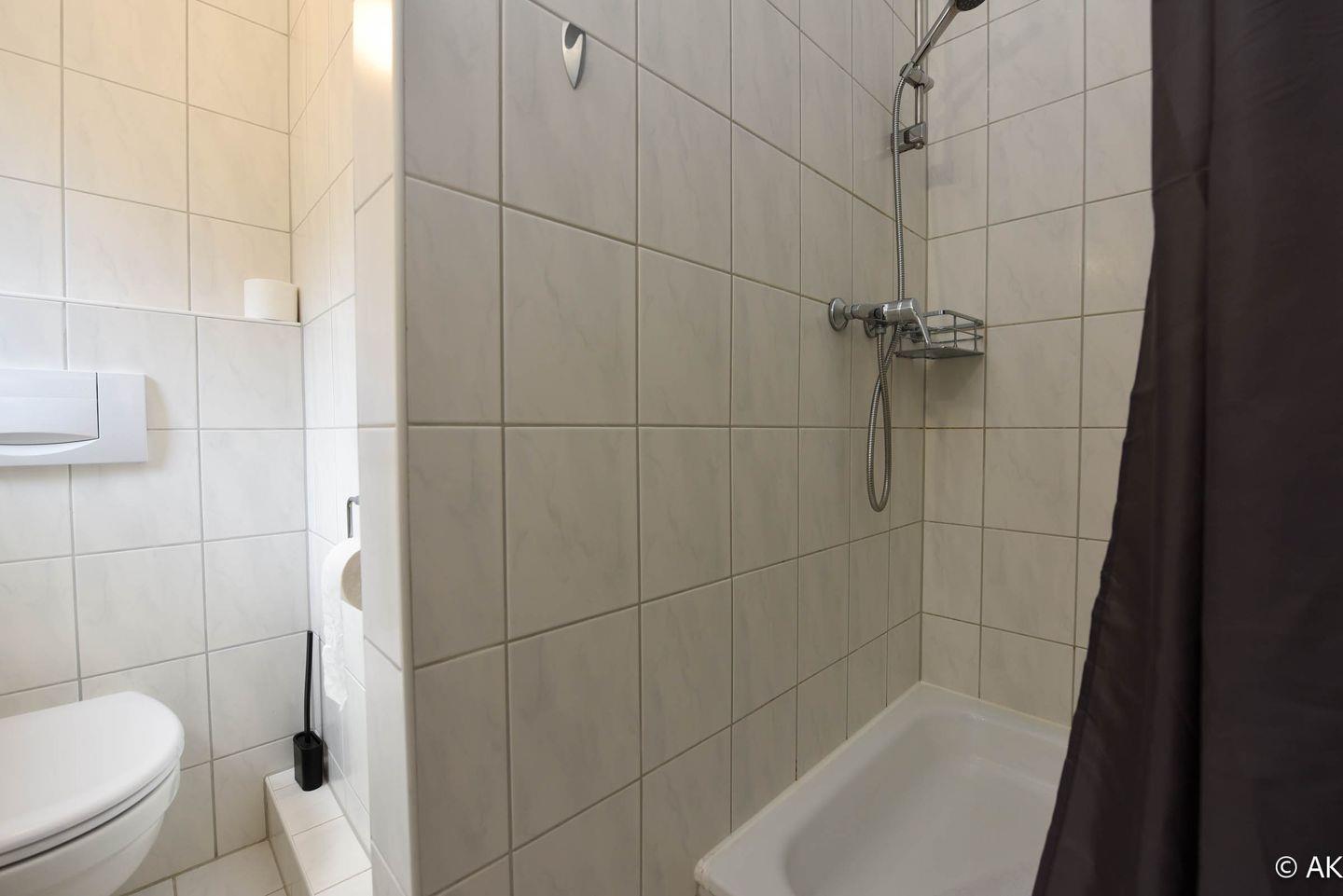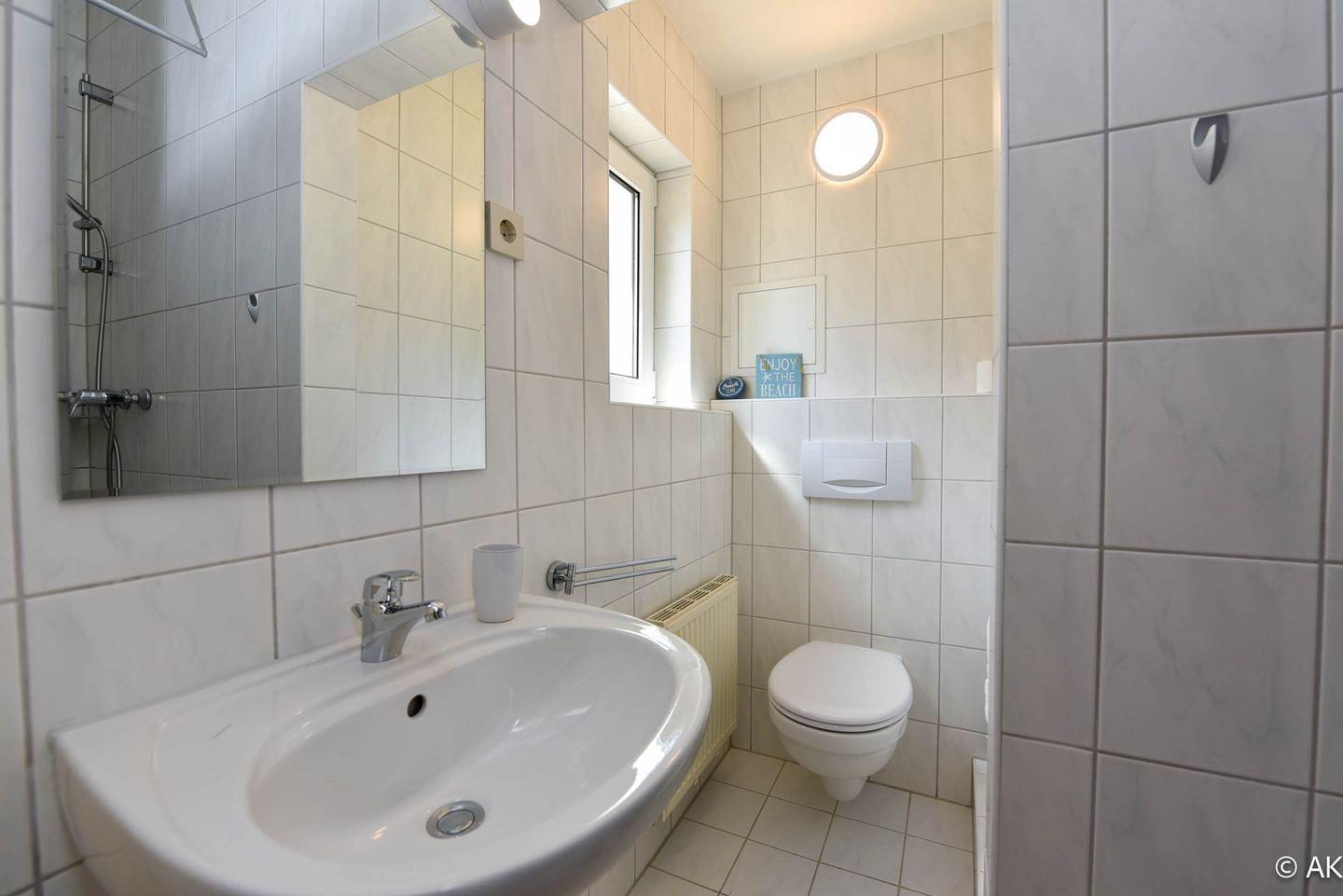 Das zweite Badezimmer, das vom Flur abgeht, bietet zusätzlichen Komfort und ist mit einer Badewanne sowie einem WC ausgestattet – perfekt für ein entspannendes Bad nach einem langen Tag am Strand.