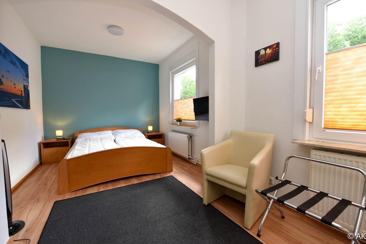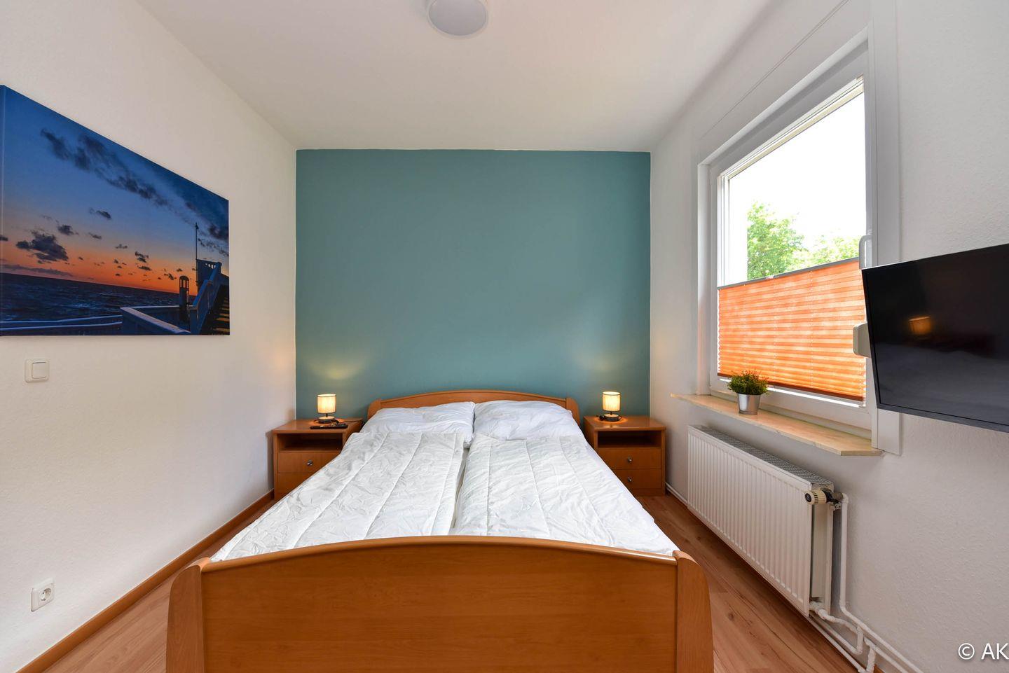 Das Schlafzimmer verfügt über ein komfortables Doppelbett, einem Kleiderschrank. Ein Flachbild-TV sorgt für Unterhaltung direkt im Schlafzimmer. Das angrenzende en-suite Badezimmer verfügt über eine Dusche und ein WC.
