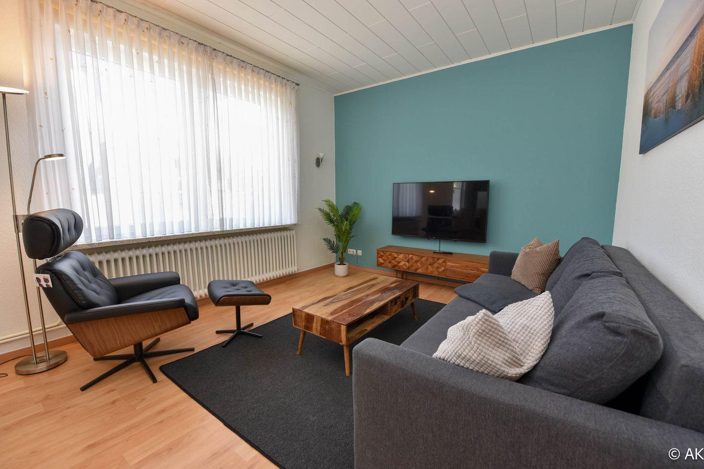 Das Wohnzimmer bietet mit einem großzügigen Ecksofa eine gemütliche Atmosphäre. Das Sofa kann zudem in ein zusätzliches Bett umgewandelt werden, sodass die Wohnung auch für bis zu vier Personen geeignet ist.