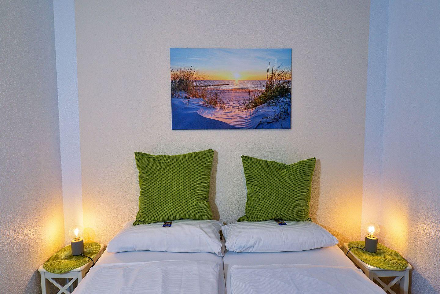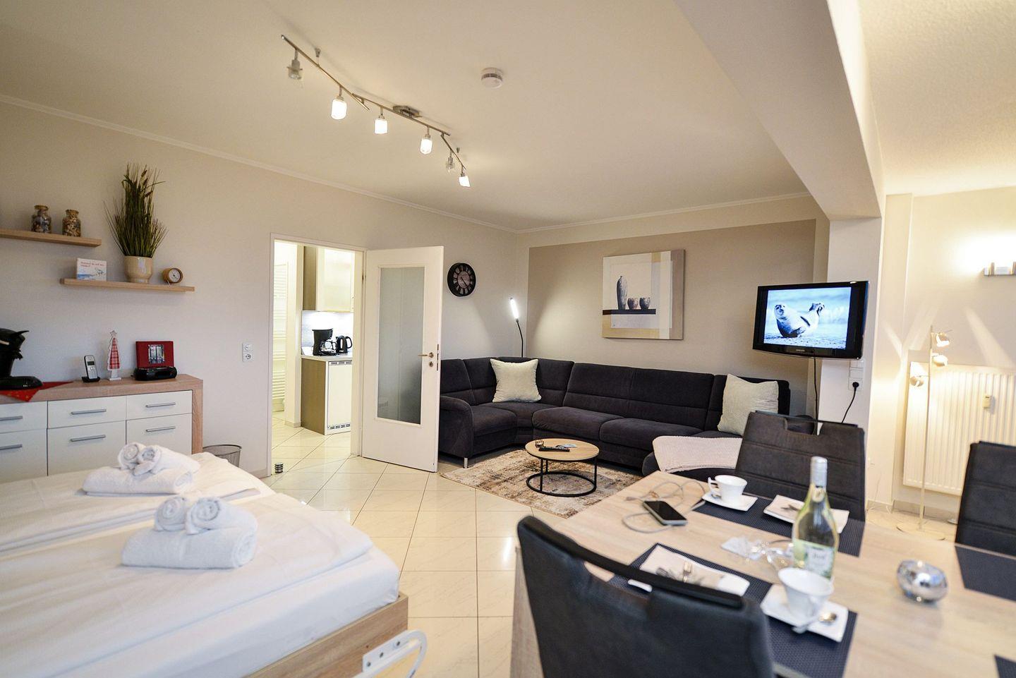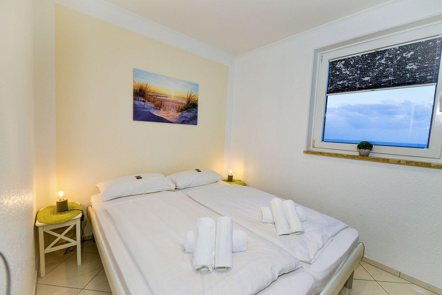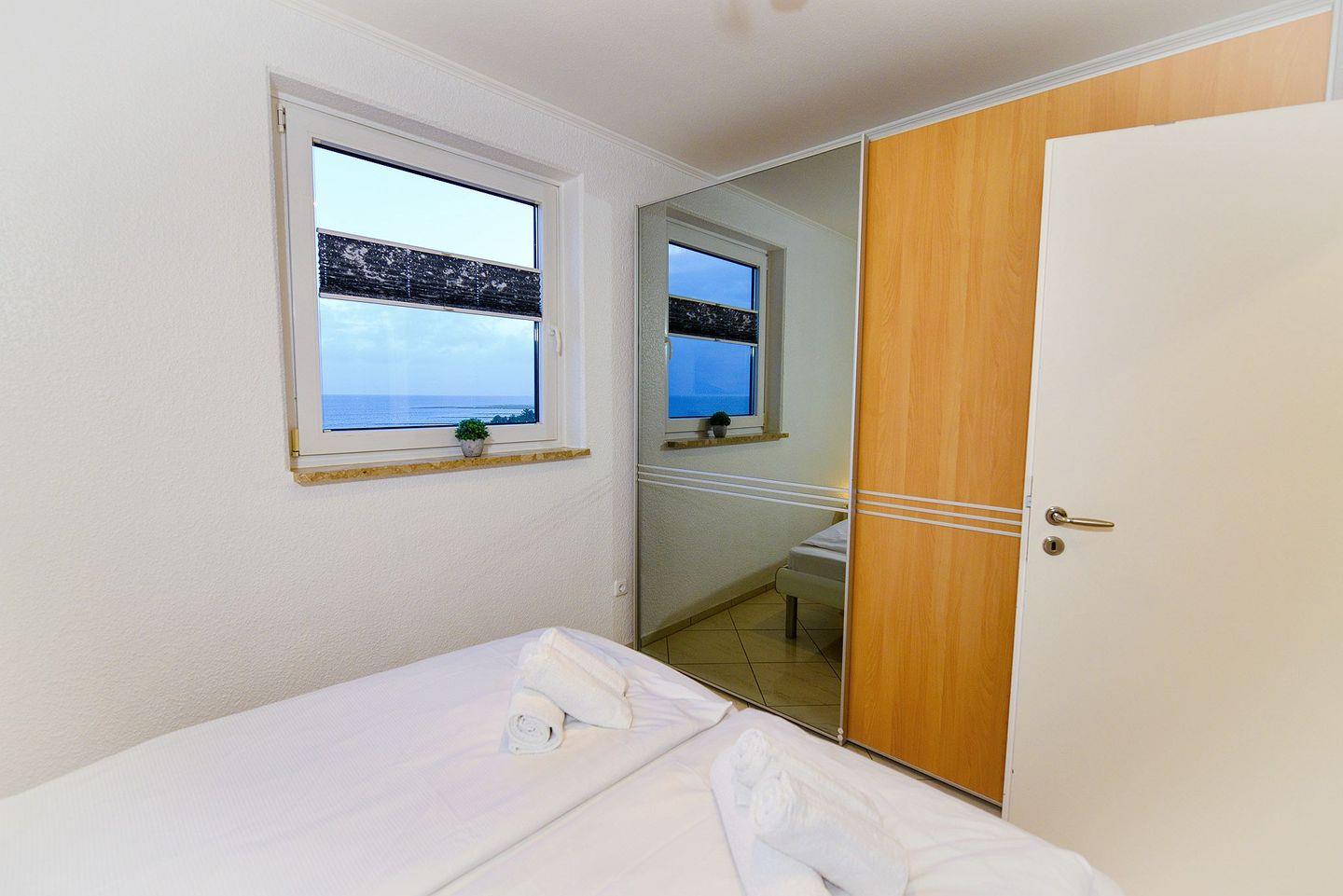 Die Wohnung verfügt über ein Schlafzimmer mit Doppelbett und ein Wohnzimmer mit gemütlicher Rundcouch sowie einem Schrankbett mit zwei 80x200 cm Matratzen . Hier können Sie entspannen, fernsehen oder einfach die Aussicht genießen.