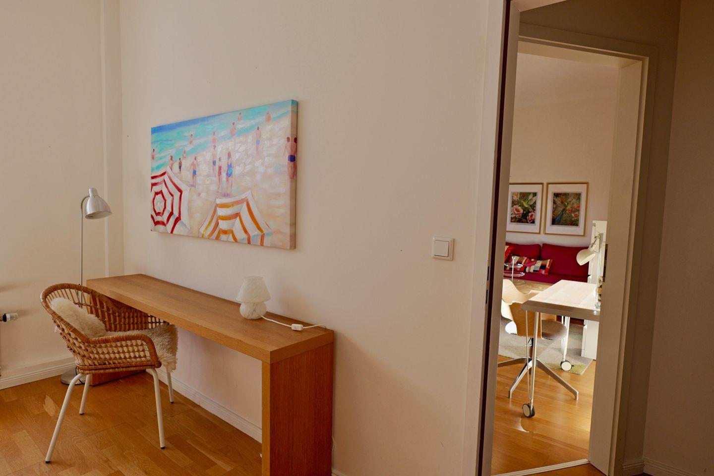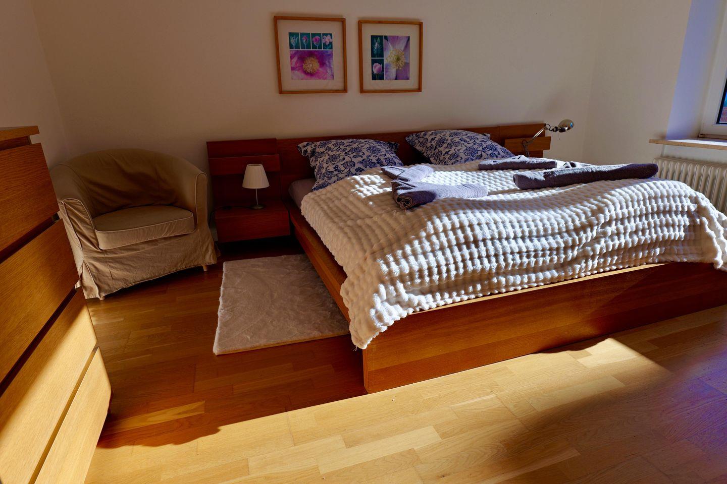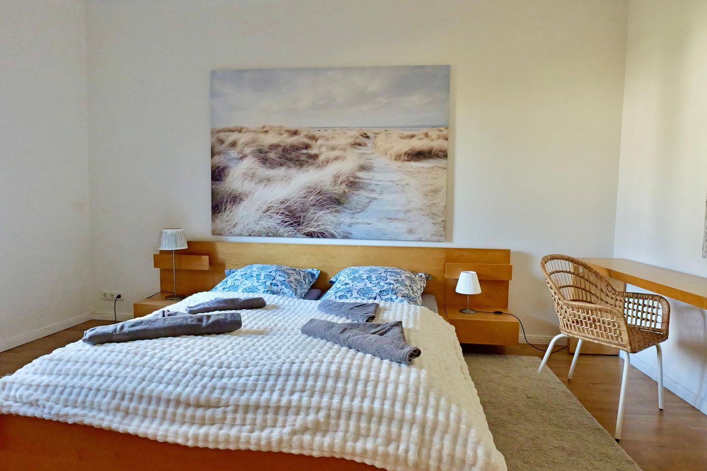 Der Wohnbereich wurde mit einem großzügigen Sofa, einem Schreibtisch und Fernseher ausgestattet. Die Küche verfügt über einen 4-Platten-Ceranfeld, eine Geschirrspülmaschine, und einen Backofen, so dass du kleine Mahlzeiten zaubern kannst. Außerdem verfügt die Ferienwohnung über zwei gemütlich eingerichtete Schlafzimmer, beide mt einem gemütlichem Doppelbett. Ein helles Badezimmer mit Waschmaschine, Trockner und Badewanne runden das Angebot ab.