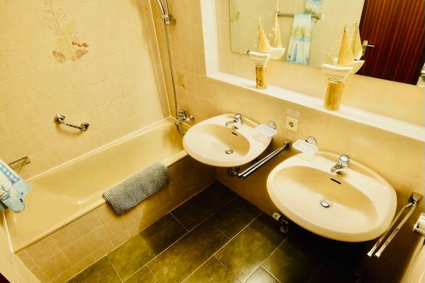 Die Küchenzeile ist praktisch in einer Nische untergebracht und mit einem 2-Platten-Herd sowie einer Mikrowelle ausgestattet – ideal für kleine Mahlzeiten. Ein Bad mit Wanne rundet das Apartment ab.