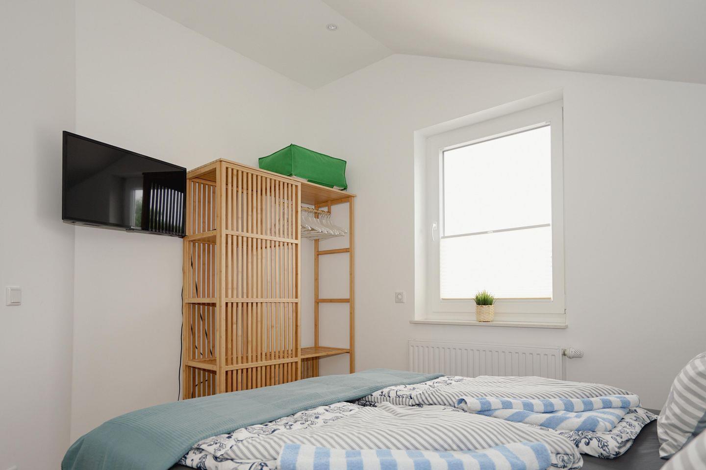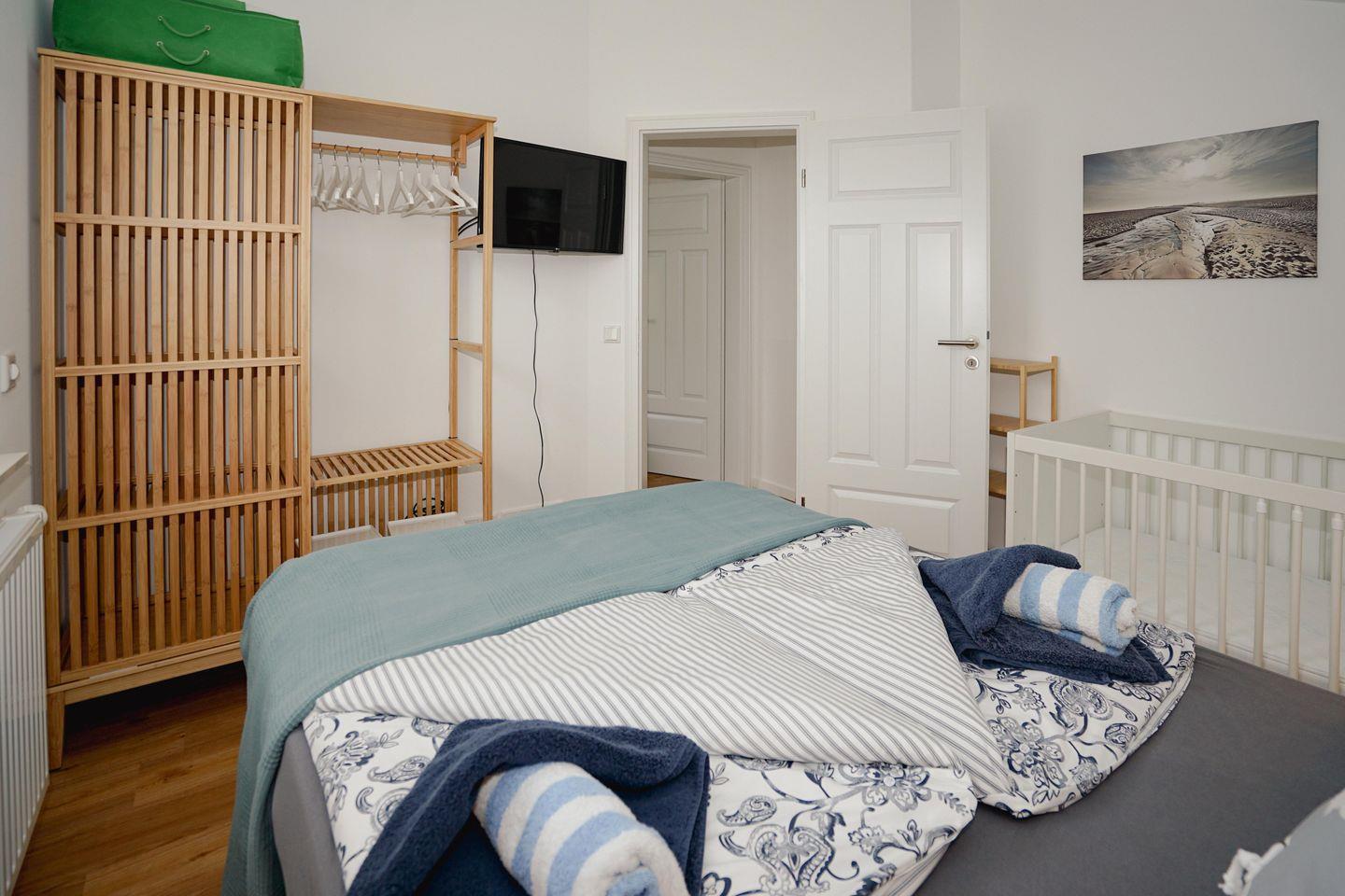 Bad mit Badewanne und Wickeltisch. Die drei Schlafzimmer mit gemütlichen Betten, teilen sich wie folgt auf: ein Schlafzimmer mit großem Doppelbett (180x200) und TV, ein Schlafzimmer mit Doppelbett, TV und Babybett (Gitterbett) und ein Kinderschlafzimmer mit Etagenbett und einem modernen Bodenbett (Hausbett).
