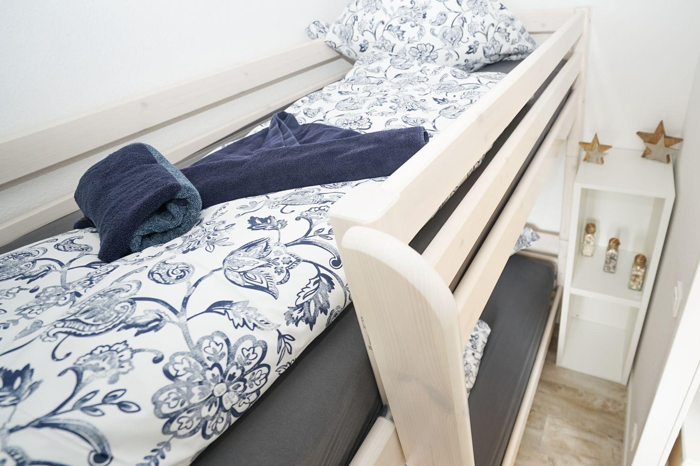 Separates kleines Zimmer mit Etagenbett, Bad mit Dusche, kleiner Flur mit Abstellraum.