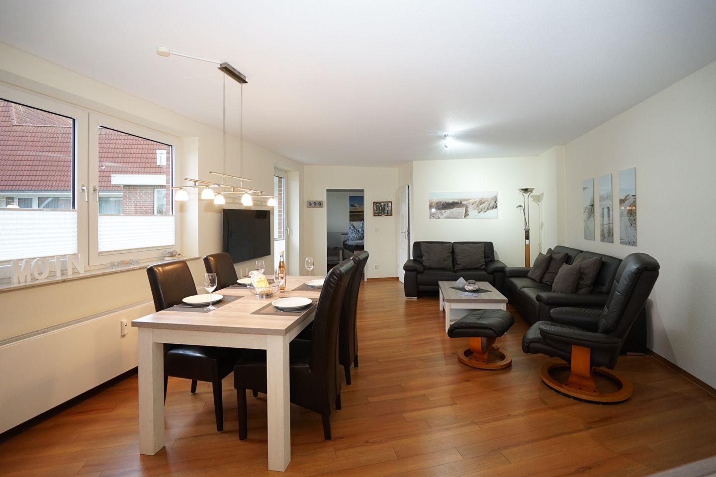 Die Wohnung besticht durch ihren hellen Wohnbereich mit gut ausgestatteter, offener Küche und großem Esstisch, gemütlichem Sofa, Sessel und Flachbild-TV.