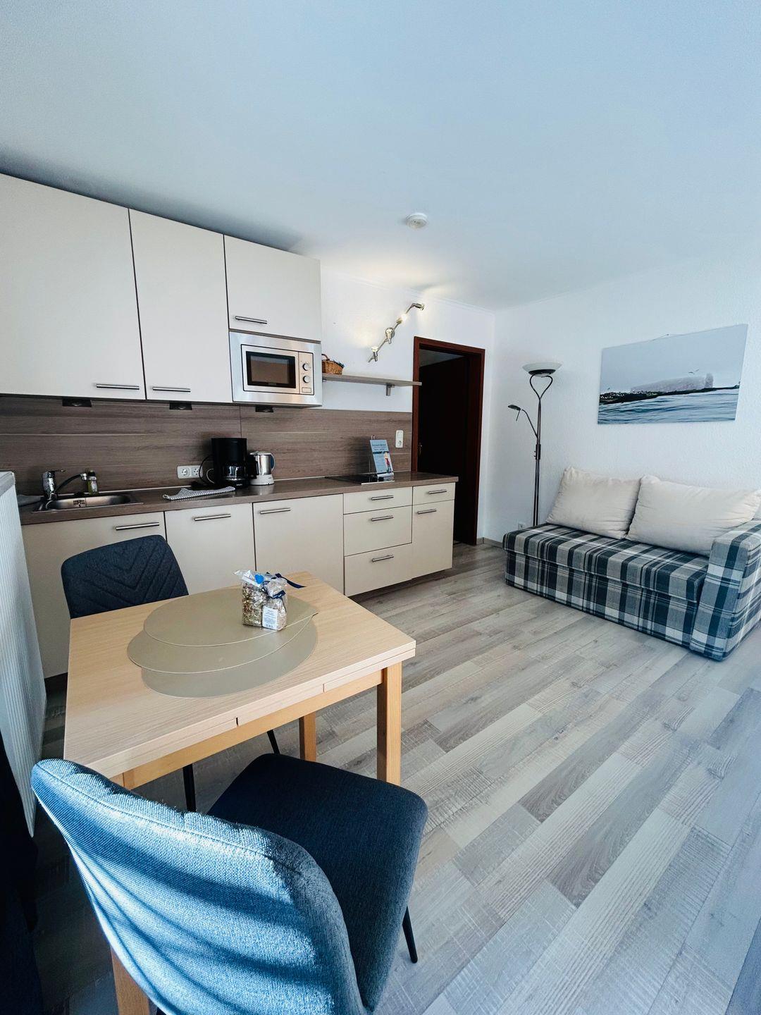Die Ferienwohnung StrandLiebe liegt direkt im Herzen von Duhnen, nur etwa 10 Gehminuten vom beliebten Sandstrand entfernt. Sie ist der perfekte Ort für deinen Urlaub, ob allein, zu zweit oder mit der Familie. Falls du mehr Platz benötigst, kannst du im selben Gebäude auch zwei weitere Ferienwohnungen buchen. Die Wohnung bietet einen gemütlichen Wohn-Schlafbereich mit Essecke, eine gut ausgestattete Einbauküche mit Spülmaschine und ein modernes Duschbad. Die Terrasse mit Gartenmöbeln lädt zum Entspannen und Verweilen ein. Auf Wunsch stellen wir dir ein Kinderbett und einen Hochstuhl zur Verfügung. In der ruhigen Umgebung kannst du den Urlaub genießen, während du schnell die Einkaufsmöglichkeiten im Ortskern erreichst. Stellplatz für dein Auto und eine Garage für Fahrräder sind ebenfalls vorhanden. Kabel-TV und WLAN sind kostenfrei. Perfekt für einen entspannten Familienurlaub an Cuxhavens schönstem Strand!