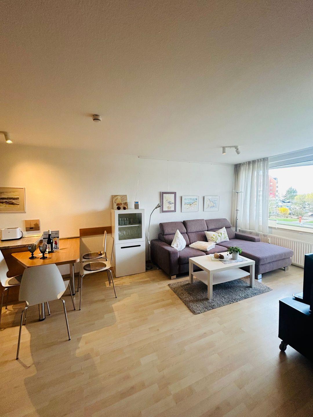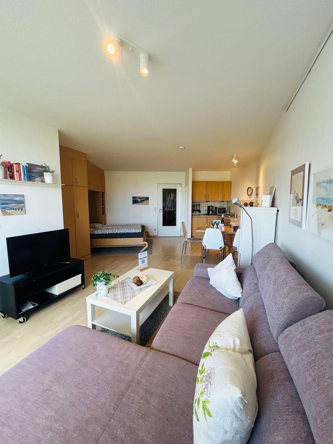 Heller Wohn-/Schlafbereich mit gut ausgestatteter, offener Küche und großem Esstisch, Sofa, Sessel und Flachbild-TV.
