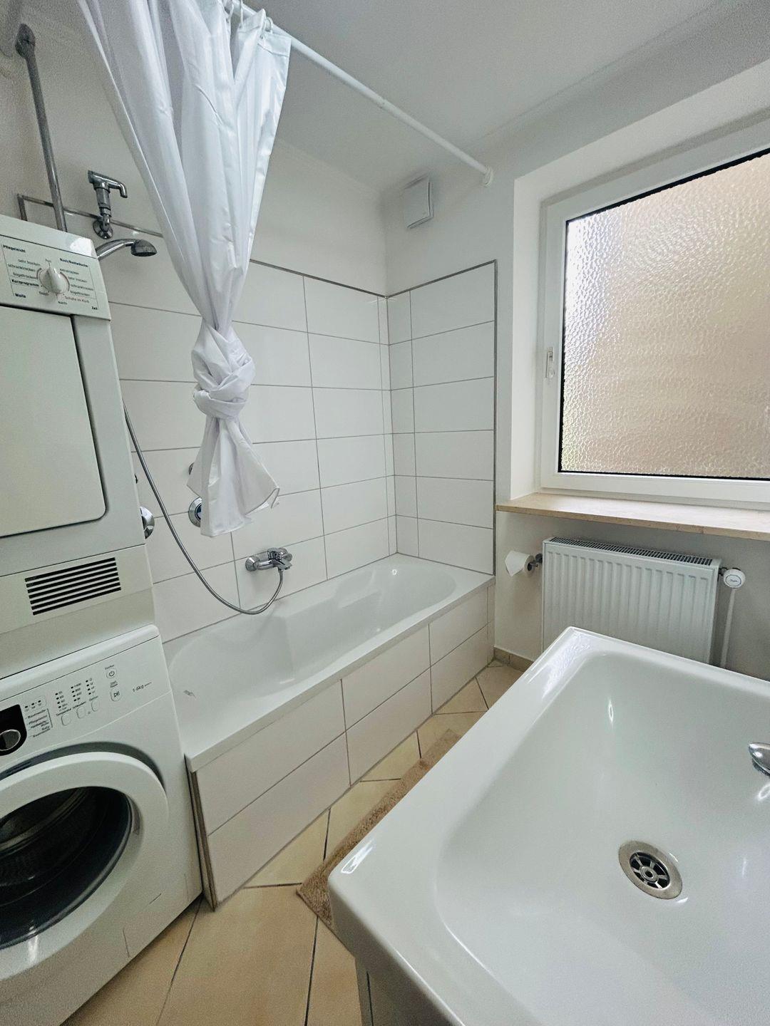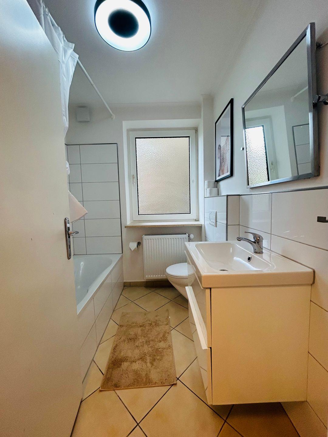 Der Wohnbereich wurde mit einem großzügigen Sofa, einer Essecke und Fernseher ausgestattet. Die Küche verfügt über einen 4-Platten-Ceranfeld, eine Geschirrspülmaschine, und einem Backofen, so dass du kleine Mahlzeiten zaubern kannst. Außerdem verfügt die Ferienwohnung über zwei gemütlich eingerichtete Schlafzimmer, eines mt einem Doppelbett und eines mit einem gemütlichen Einzelbett. Ein helles Badezimmer mit Waschmaschine, Trockner und Badewanne runden das Angebot ab.