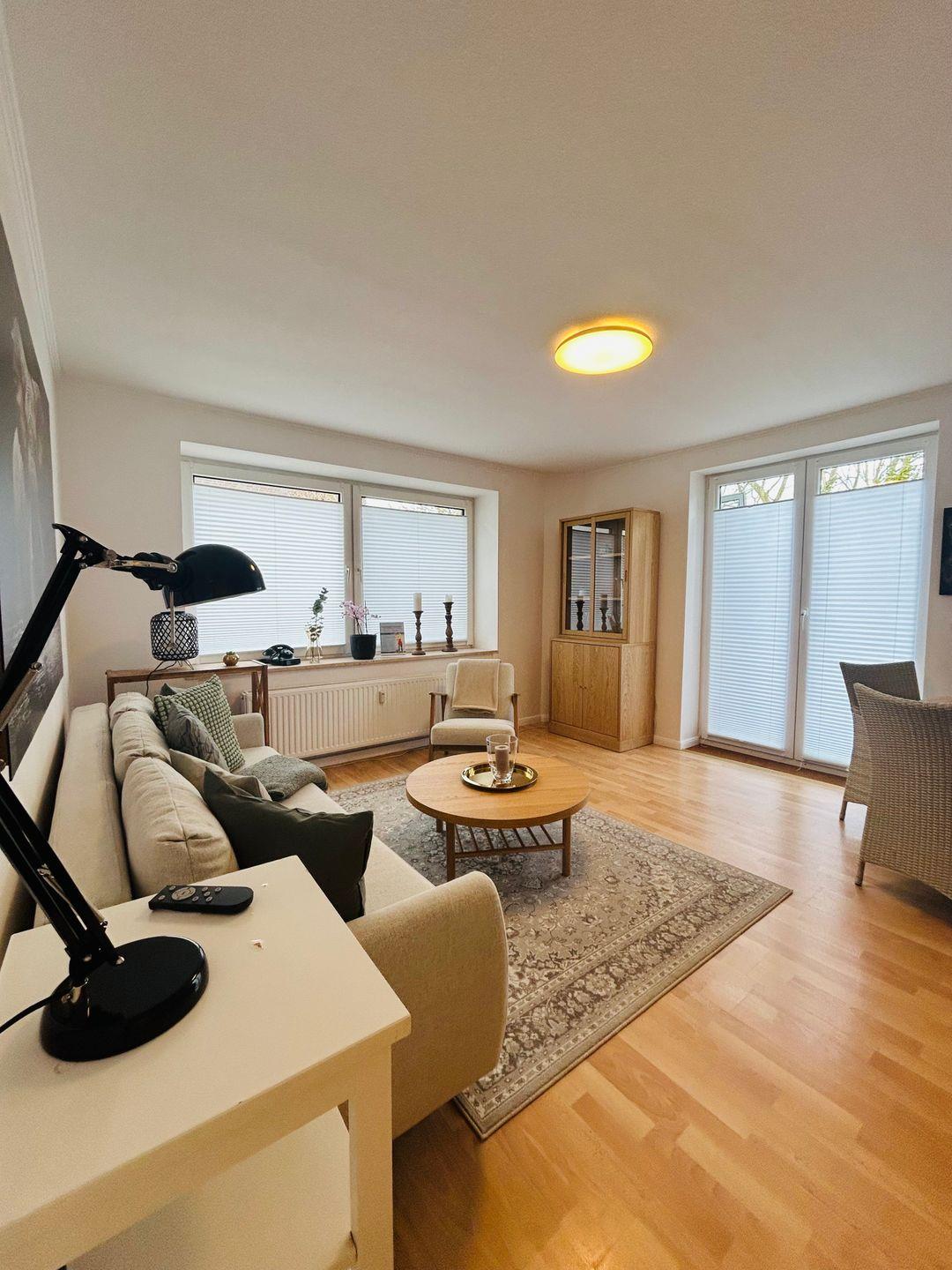 Die 3-Zimmer-Ferienwohnung befindet sich im Erdgeschoss, in einer verkehrsberuhigten Straße in Döse.