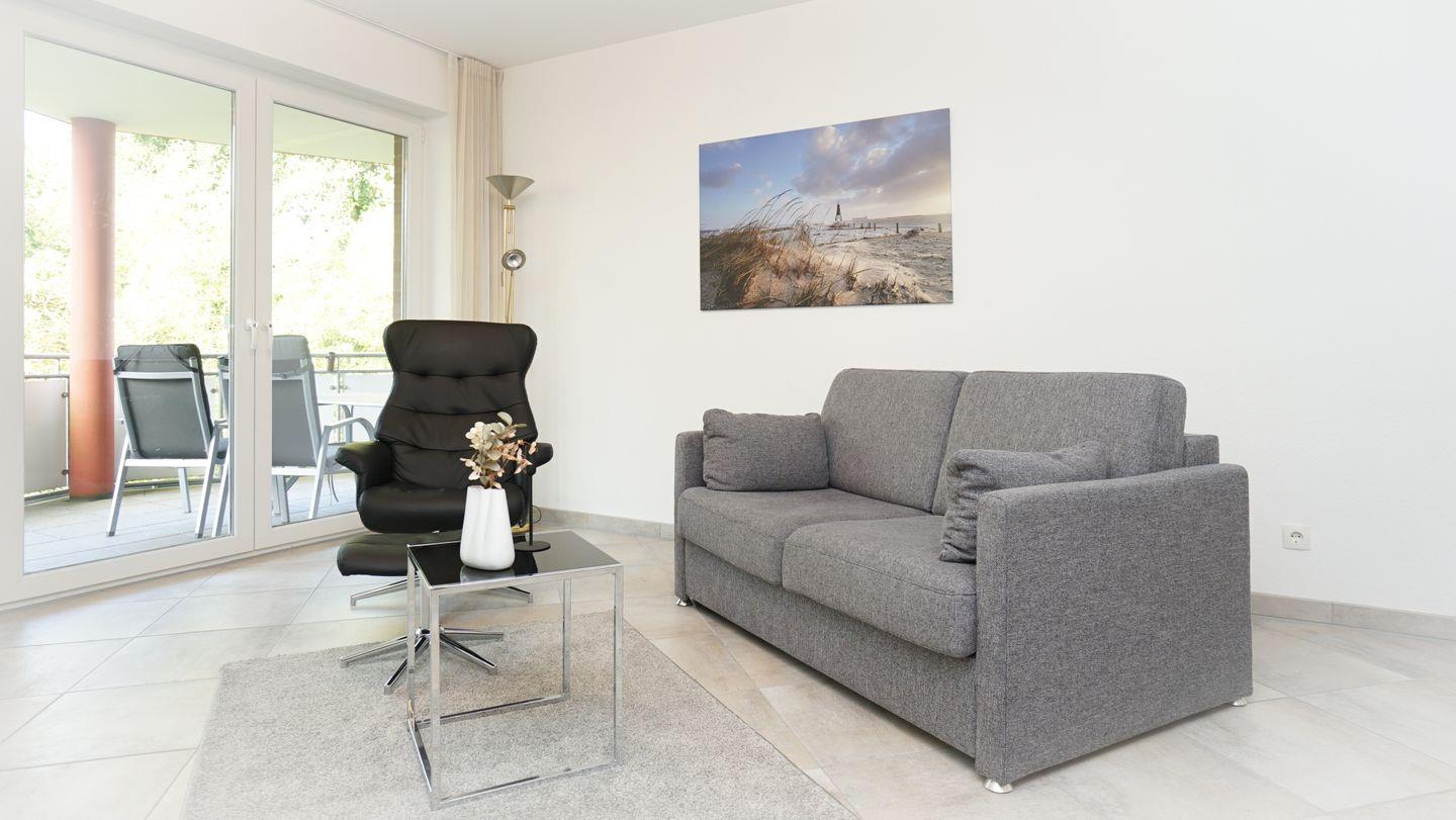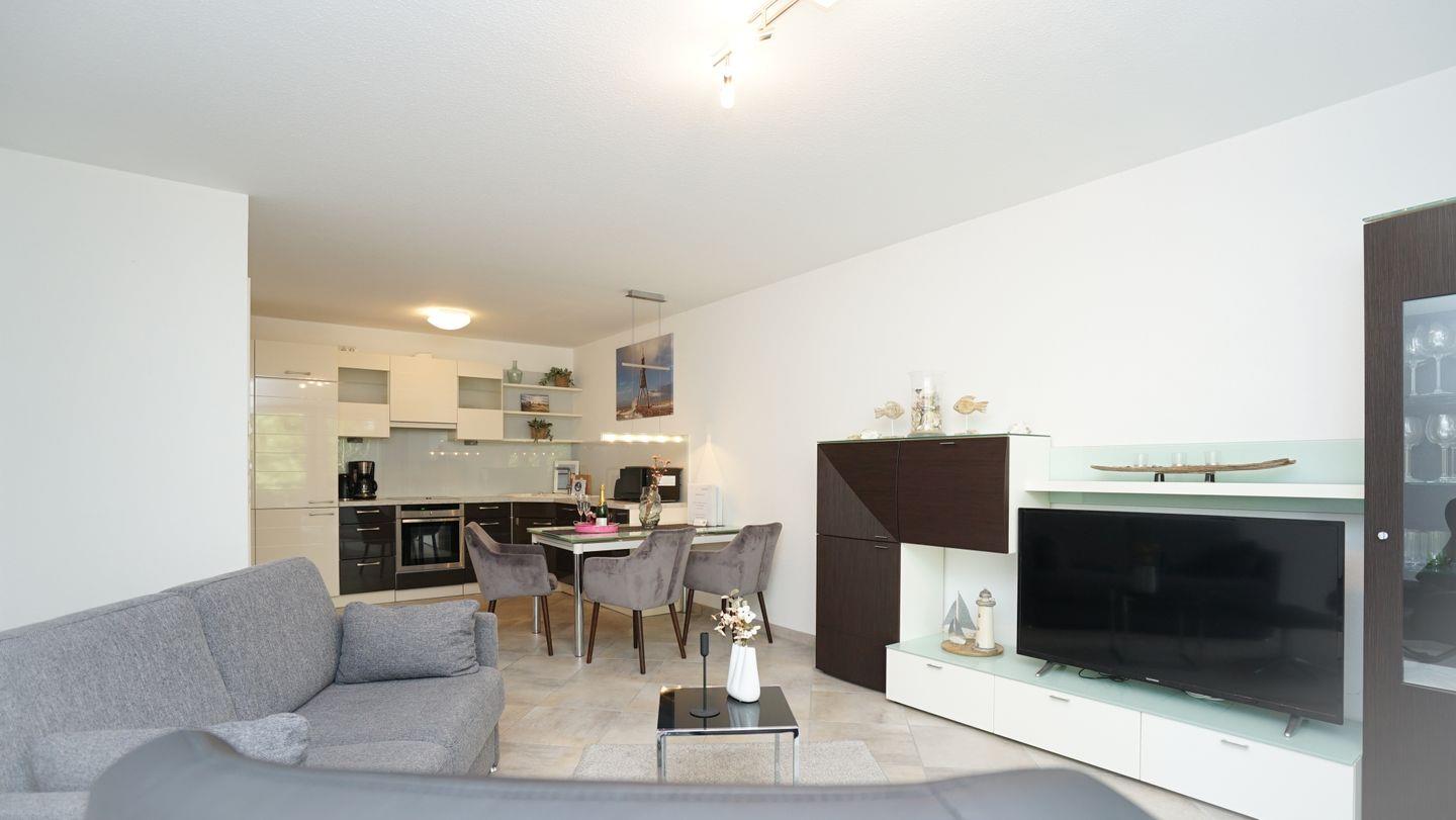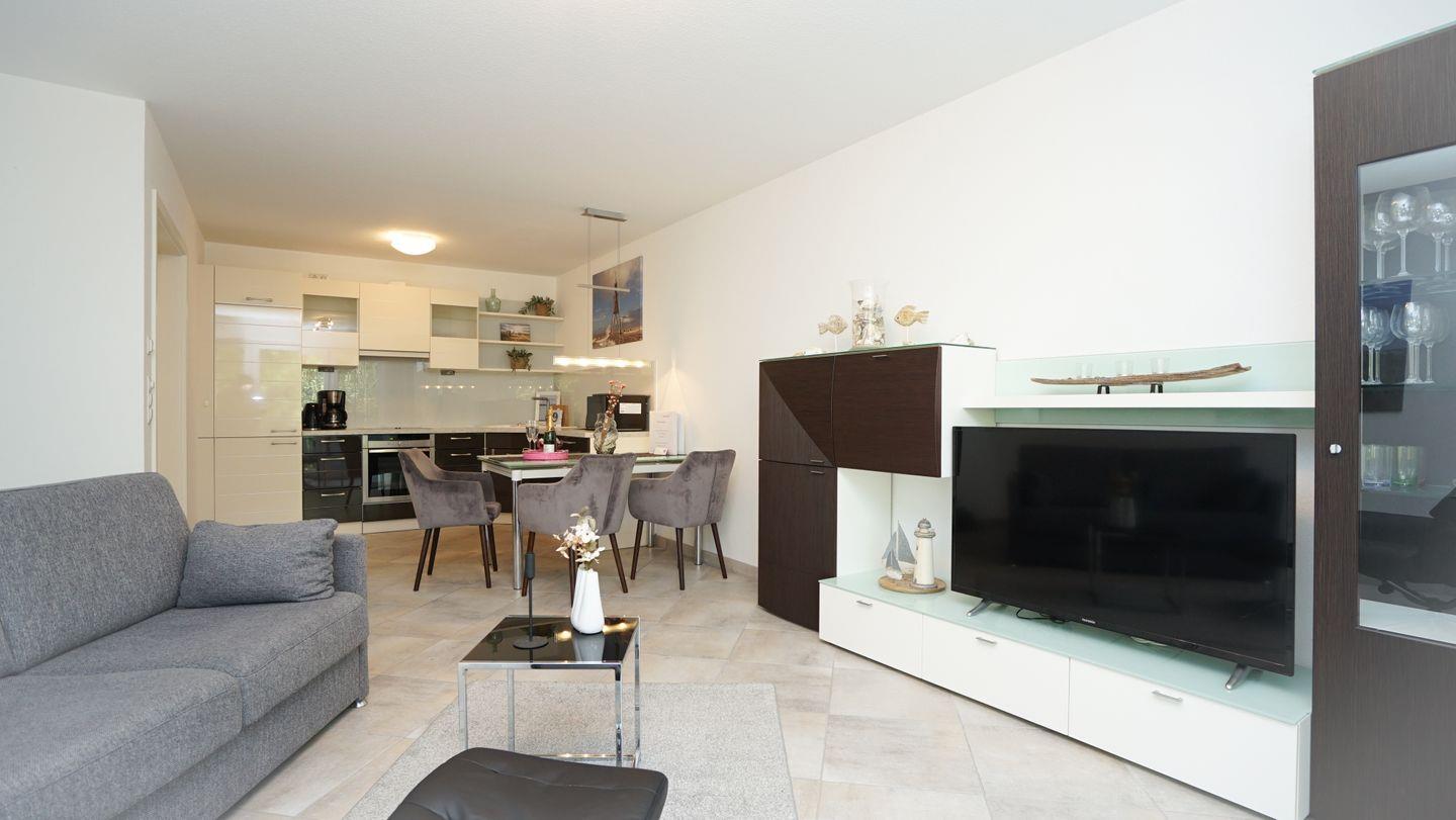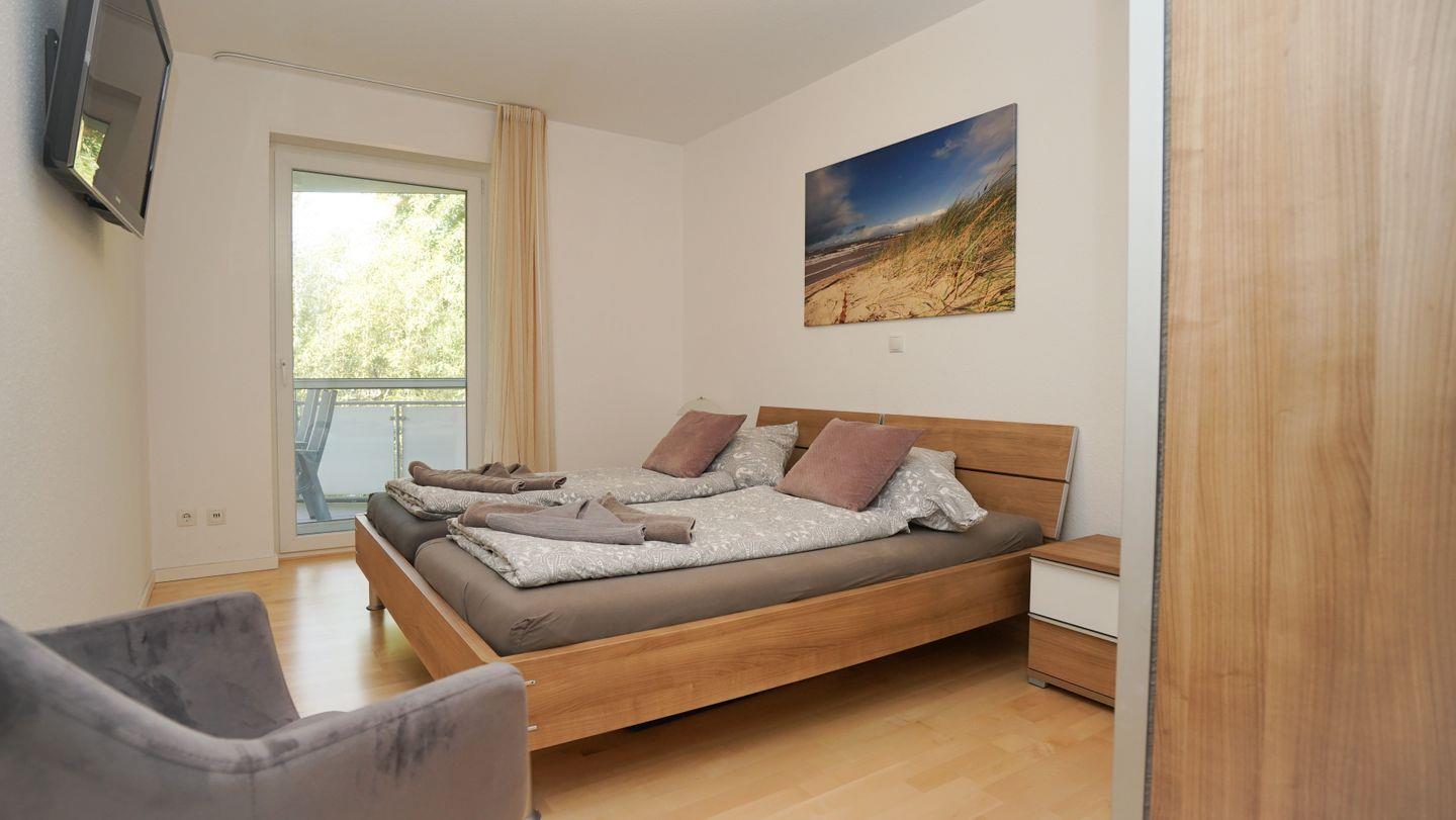 Die geräumige Wohnung bietet ausreichend Platz für bis zu vier Personen. Sie besteht aus einem gemütlichen Schlafzimmer mit einem großen Doppelbett, einem Kleiderschrank und einem TV. Vom Schlafzimmer aus, ebenso wie vom Wohnbereich, hast du direkten Zugang zum Balkon, auf dem du die frische Luft und die ruhige Umgebung genießen kannst. Der offene Wohn-/Schlaf-/Essbereich ist hell und freundlich gestaltet und bietet ein zusätzliches, gemütliches Schlafsofa für zwei Personen.