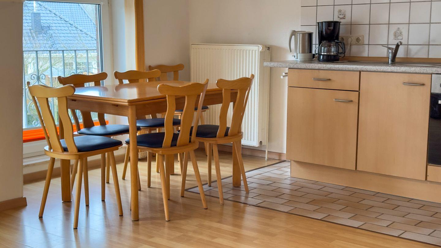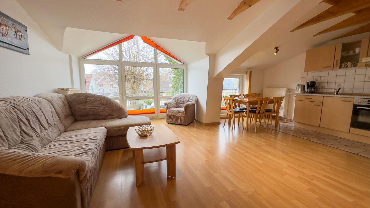 Die über zwei Etagen erstreckende Unterkunft hat insgesamt vier Zimmer, darunter zwei komfortable Schlafzimmer die einen erholsamen Schlaf gewährleisten. Die modern gestaltete Küche lädt dazu ein, selbst köstliche Mahlzeiten zuzubereiten. Der Essbereich in der Wohnung bietet ausreichend Platz, um die gemeinsamen Speisen zu genießen und gesellige Abende zu verbringen. Das Wohnzimmer ist der ideale Ort, um zu entspannen. Hier finden Sie eine angenehme Sofaecke, die zum Verweilen und Verweilen einlädt. Genießen Sie den Blick aus den Fenstern, die mit Sichtschutz ausgestattet sind, um ein Höchstmaß an Privatsphäre gewähren.