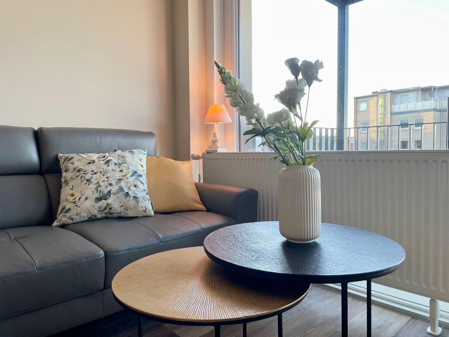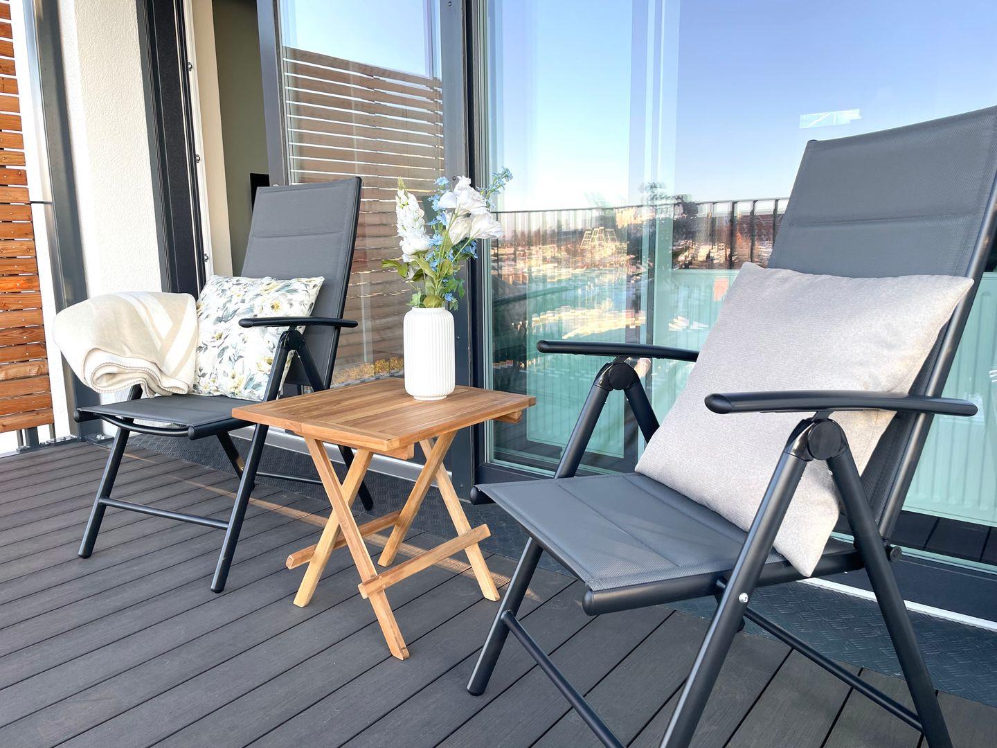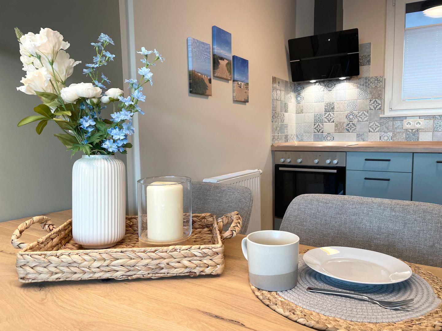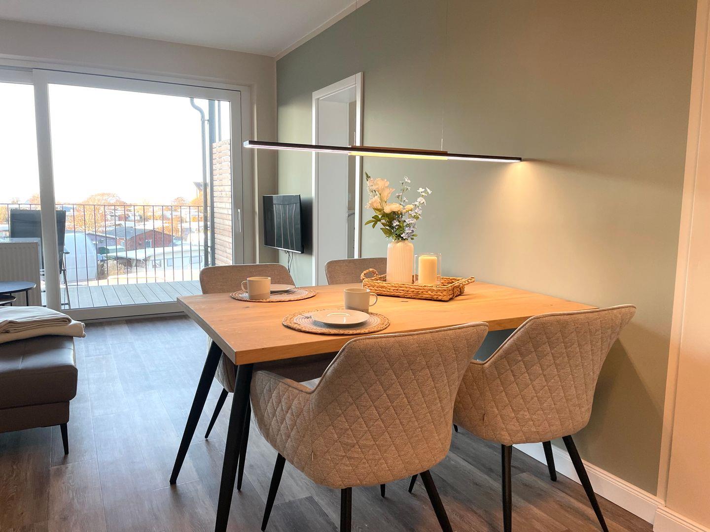 Das Herzstück der Wohnung ist der offene Wohnbereich, der mit einer Sofaecke und einem Esstisch ausgestattet ist. Hier können Sie entspannen und gemeinsame Zeit verbringen. Der Wohnbereich bietet zudem einen Fernseher für gemütliche Filmabende. Die voll ausgestattete Küche lässt keine Wünsche offen: Hier finden Sie alle Utensilien, die Sie zum Kochen benötigen. Darunter Herd, Mikrowelle, Kühlschrank, Geschirrspüler und Kaffeemaschine. Genießen Sie Ihre Mahlzeiten im Essbereich oder auf dem überdachten Balkon mit Meerblick, wo Sie die sanfte Brise der Nordsee spüren können.