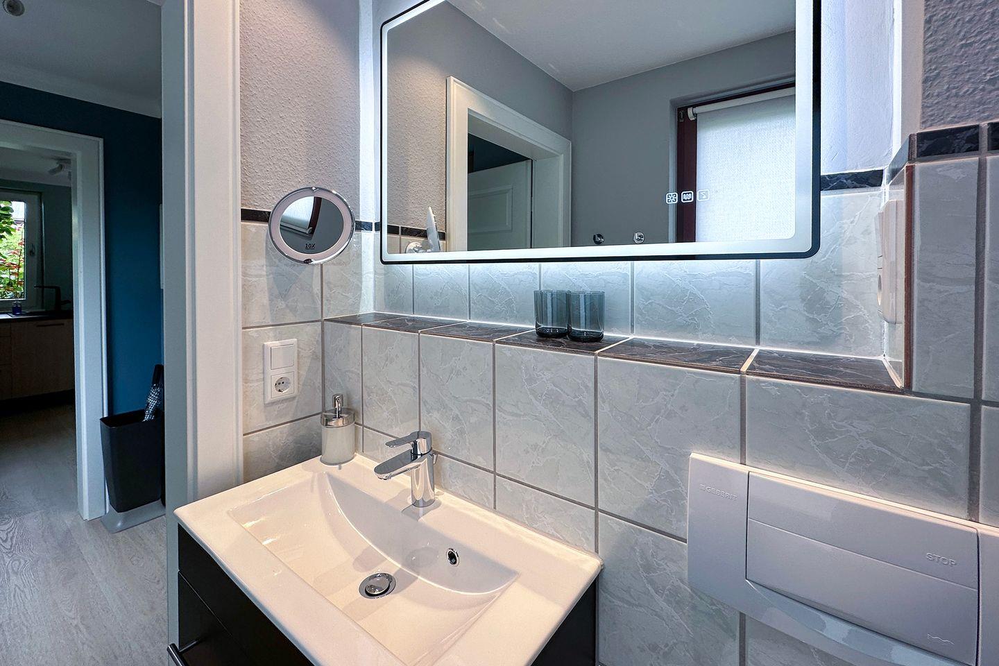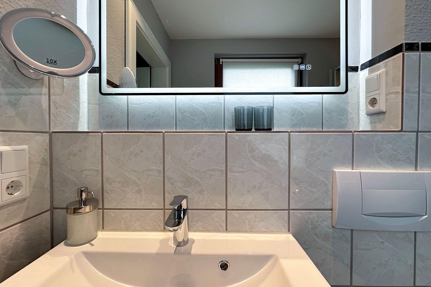 Entspannen Sie im Wohnzimmer, das mit Vinyl-Bodenbelag ausgestattet ist, und lassen Sie die Seele baumeln. Das Bad überzeugt mit einer Regendusche und ist ebenfalls perfekt ausgestattet mit einem beleuchtbaren Kosmetikspiegel und einem Haartrockner.