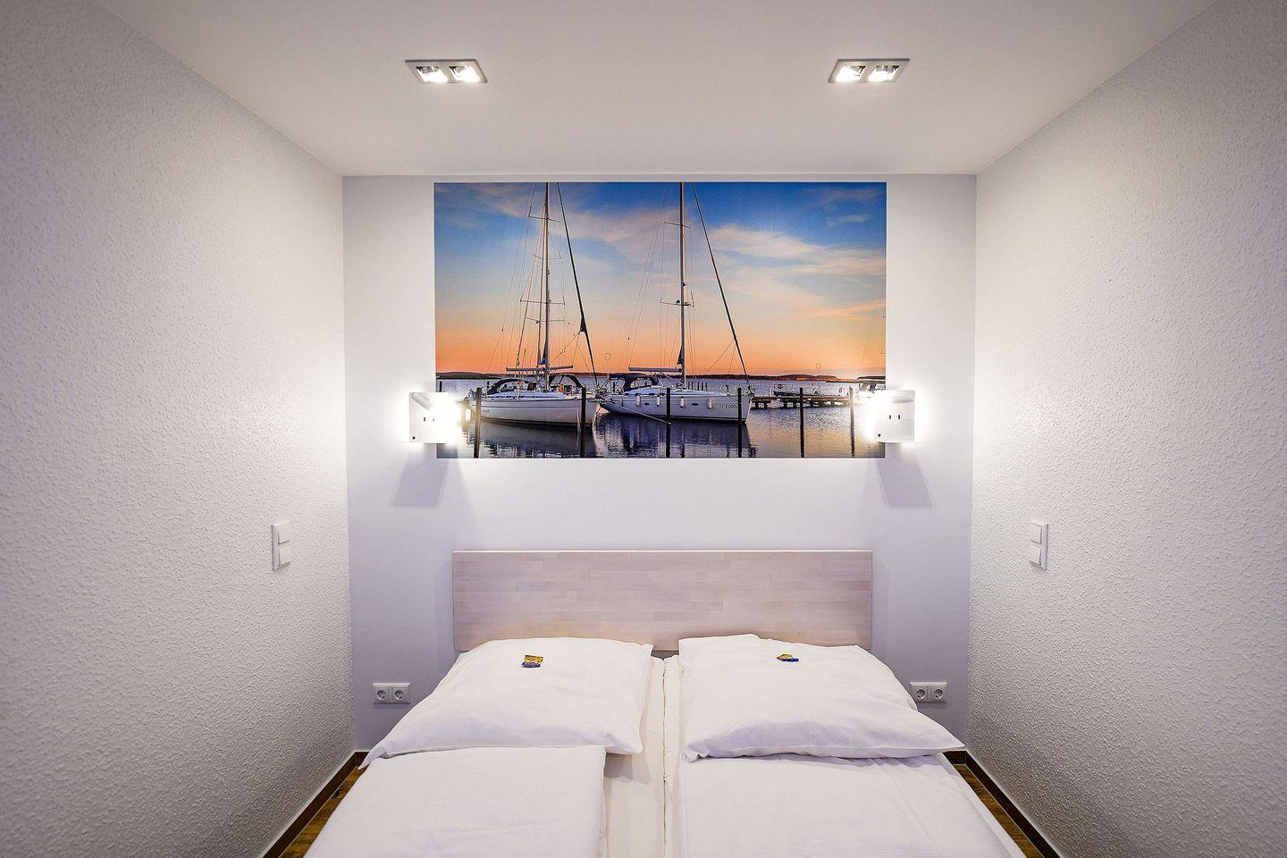 Das separate Schlafzimmer ist mit einem Tandembett ausgestattet. Im Wohnbereich stehen zwei weitere Schlafplätze in einem Doppelbett zur Verfügung. Das gepflegte Badezimmer verfügt über eine Badewanne mit fester Duschwand. Die offene Raumaufteilung und große Fenster sorgen für eine freundliche Wohnatmosphäre.
