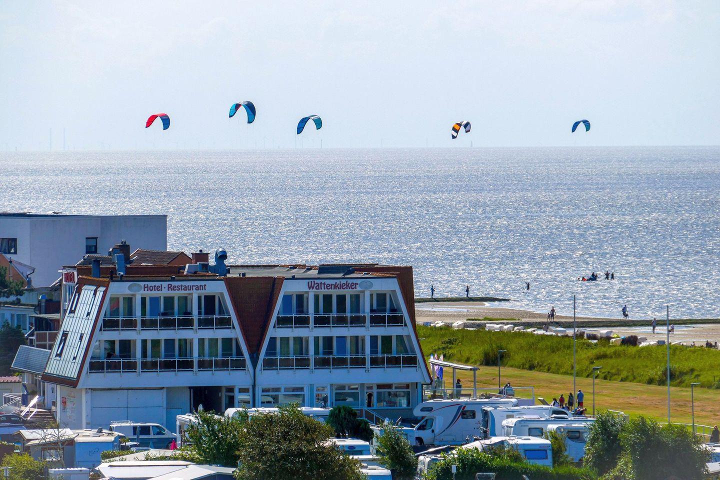 Ferienwohnung in Cuxhaven-Sahlenburg mit Meerblick: Gemütliche Nichtraucher-Unterkunft für 2–4 Personen mit Balkon, Schlafzimmer, Doppelschrankbett, Bad mit Badewanne, Haustiere erlaubt. Schwimmbad, Sauna, Ruheraum im Haus. Ruhige Lage nahe dem Strand. Kostenfreier PKW-Stellplatz am Haus. Ideal für Paare & Familien.