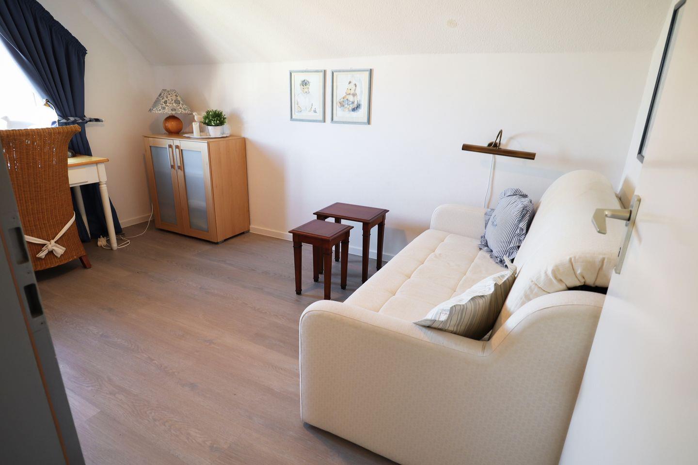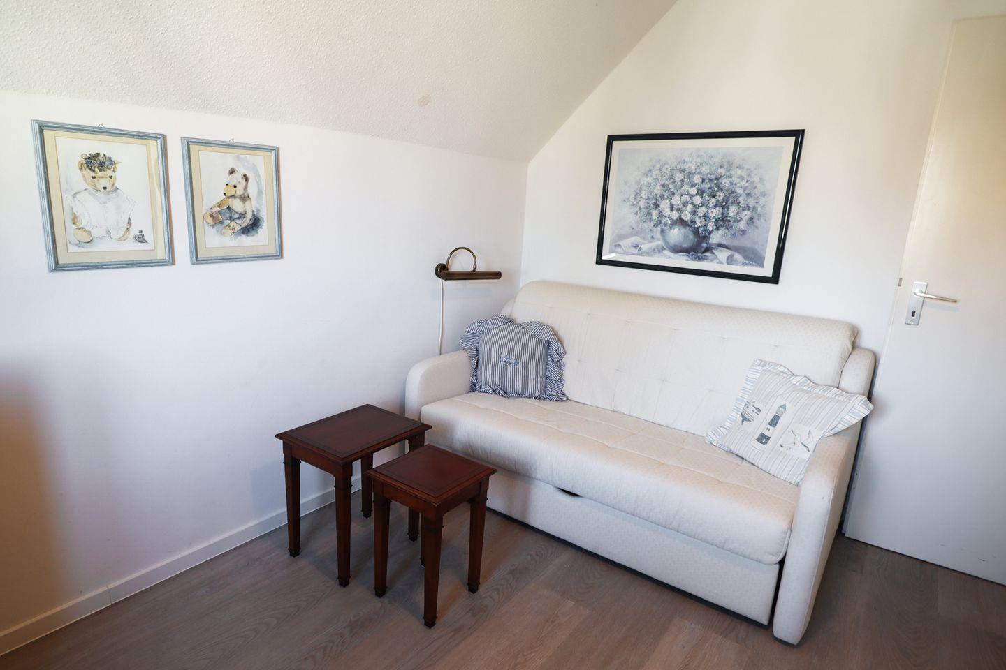 Das separate Schlafzimmer ist mit einem bequemen Doppelbett ausgestattet und sorgt für ruhige Nächte. Für weitere Gäste bietet die hochwertige Schlafcouch im Wohnbereich eine zusätzliche Schlafmöglichkeit.