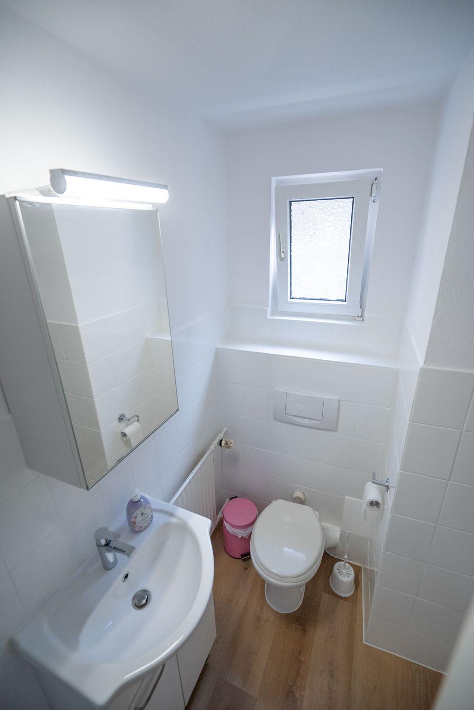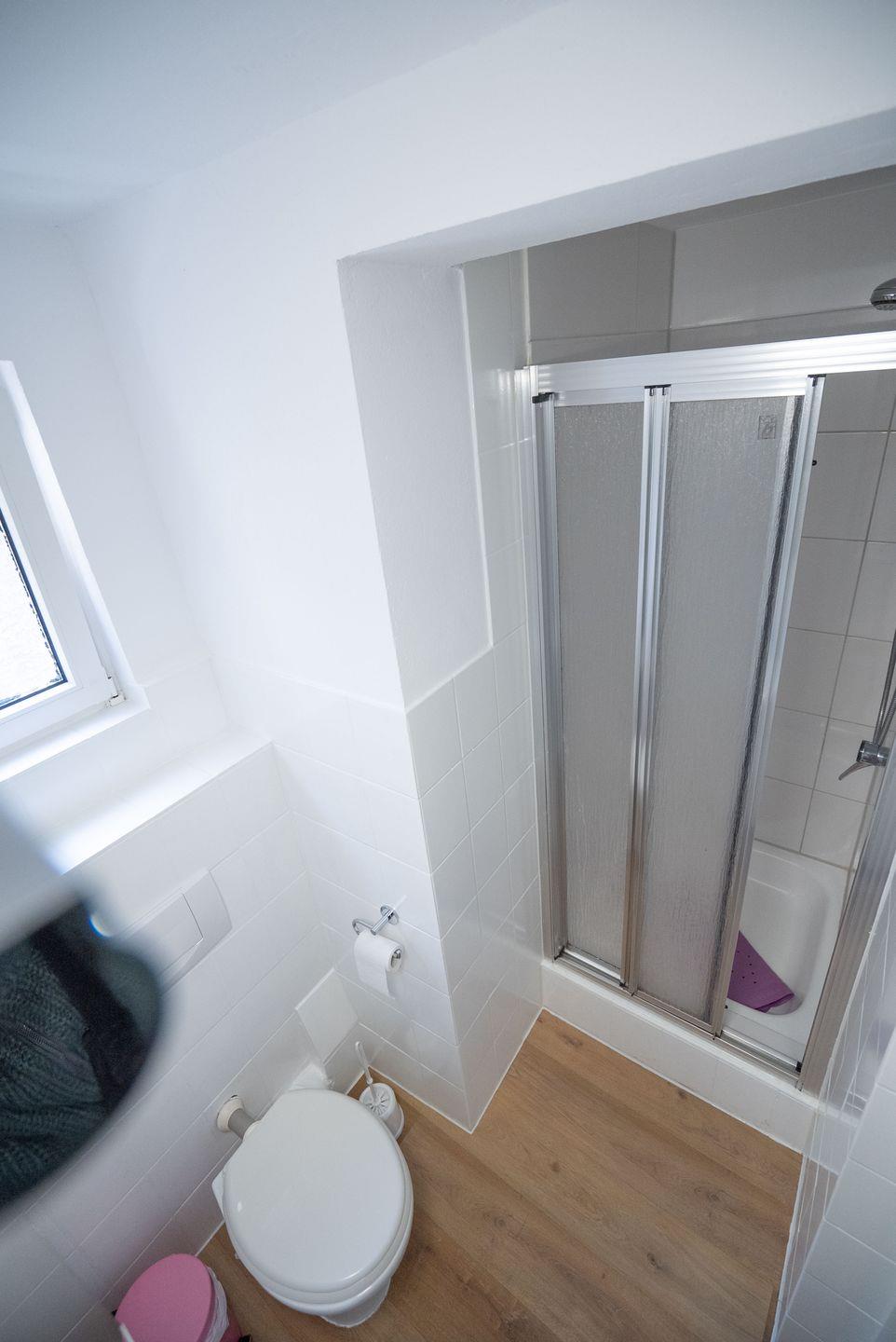 Das Badezimmer ist kompakt und funktional eingerichtet. Es verfügt über eine Dusche, ein WC, ein Waschbecken und einen Spiegel – alles, was Sie für den täglichen Komfort benötigen.