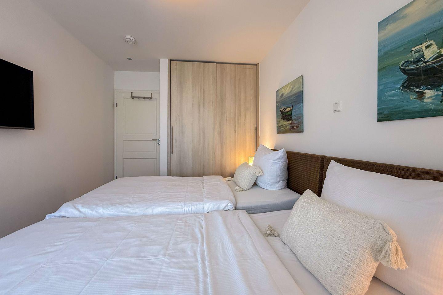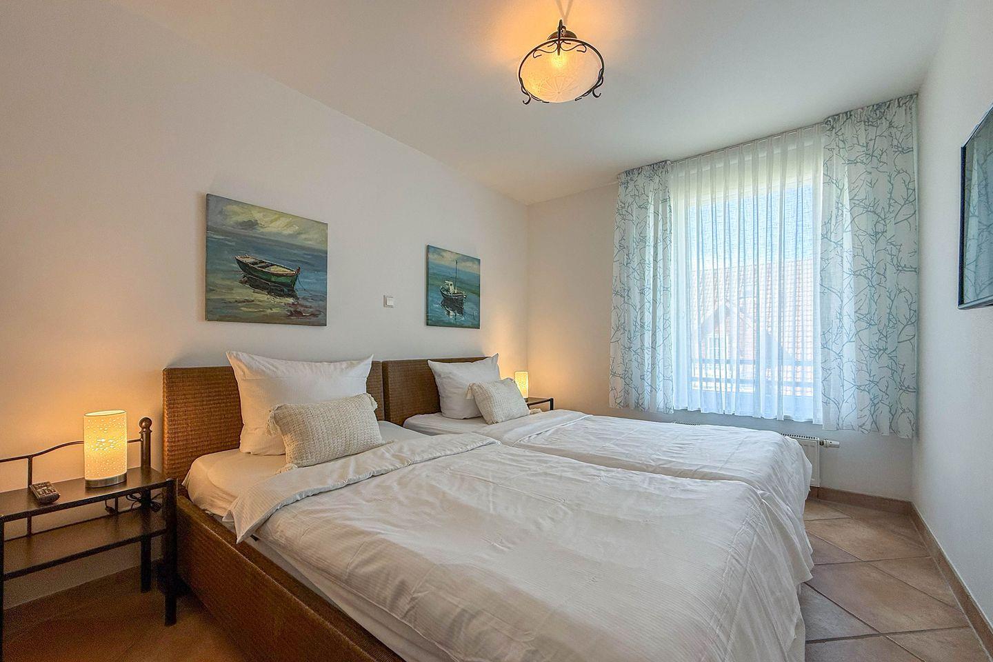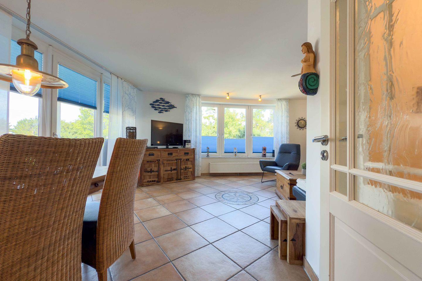 Mit insgesamt 75 m² Wohnfläche, verteilt auf drei Zimmer, zwei separate Schlafzimmer und ein großzügiges Wohnzimmer, finden hier bis zu vier Personen komfortabel Platz. Die gesamte Wohnung ist mit einem pflegeleichten Fliesenboden mit Fußbodenerwärmung ausgestattet. Große Fenster mit Sichtschutz sorgen für Licht und Privatsphäre gleichermaßen. Für einen ungestörten Aufenthalt ist die Wohnung ausschließlich für Nichtraucher vorgesehen.