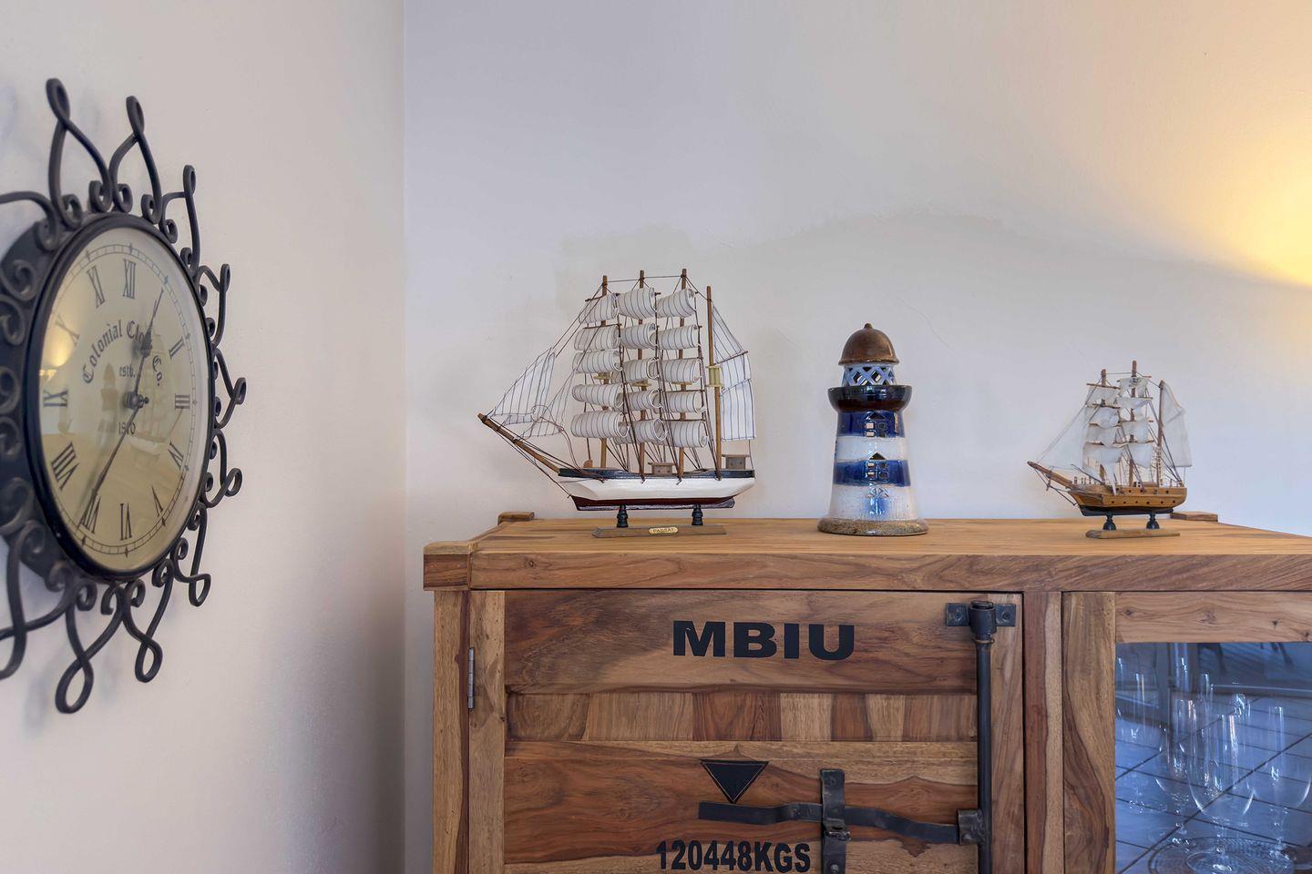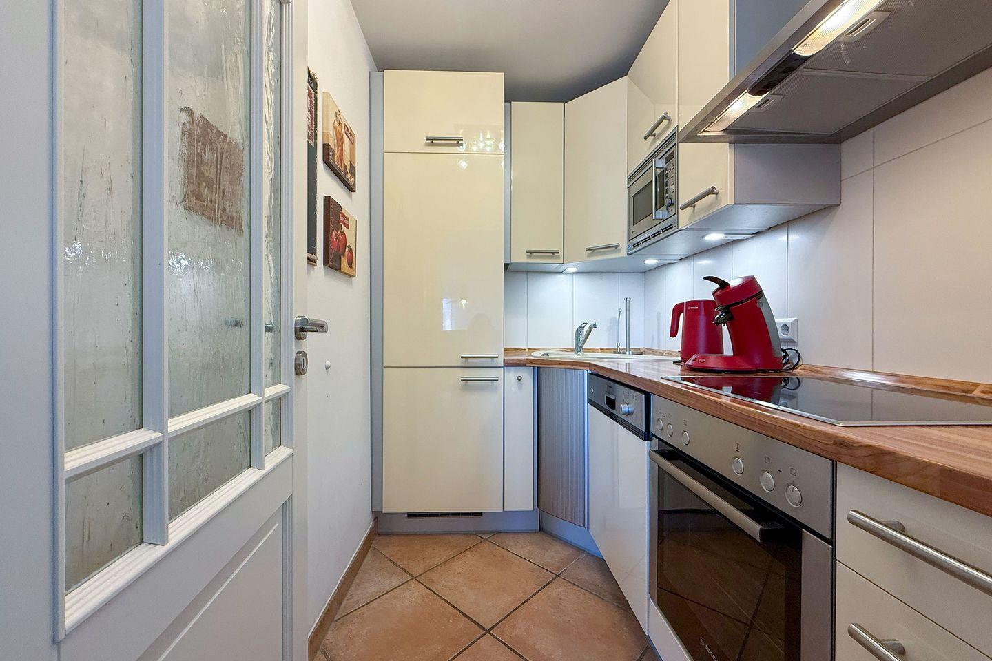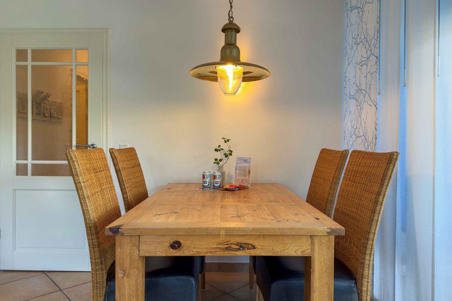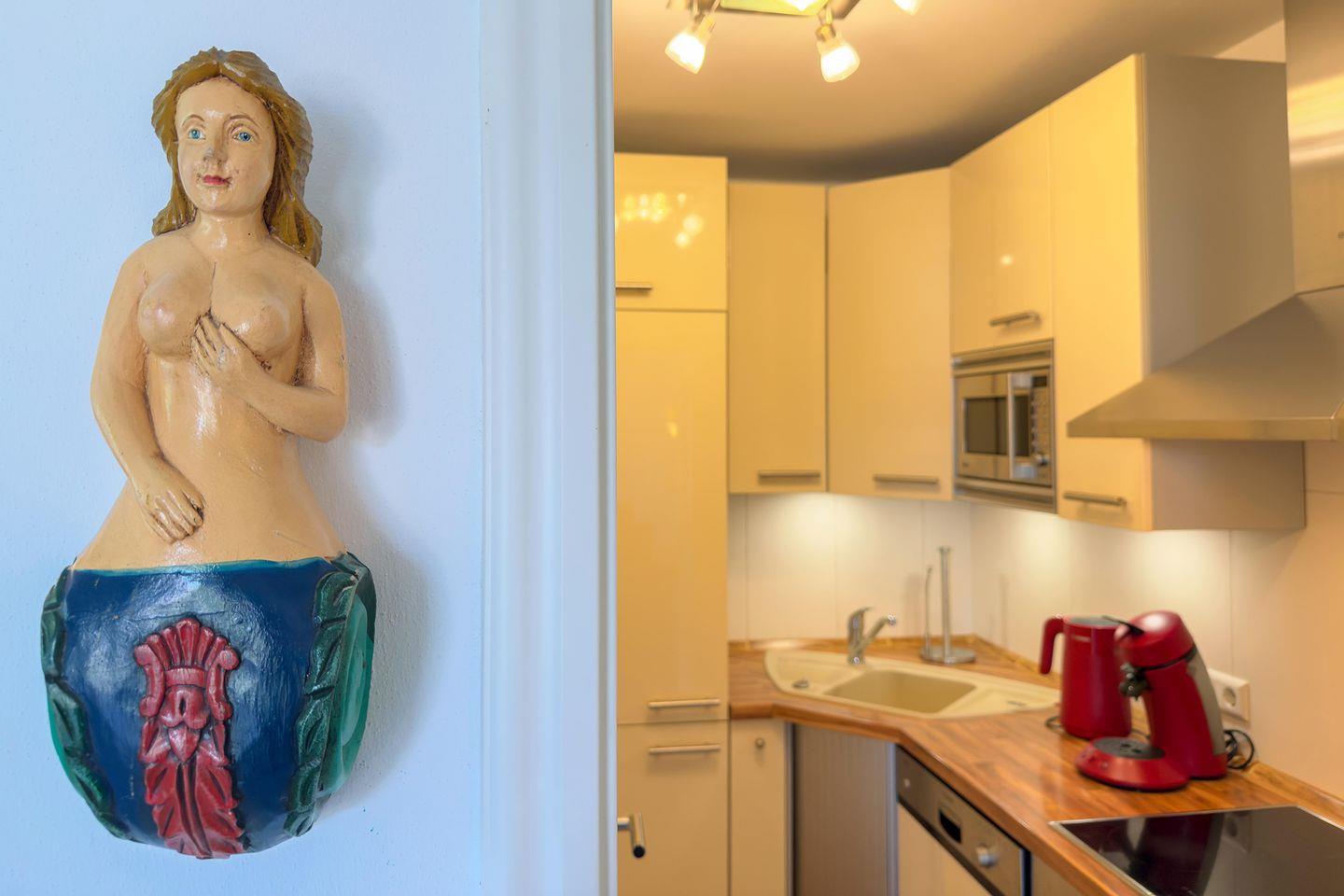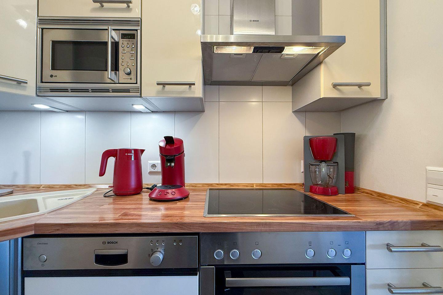 Die abgeschlossene Küche ist vollständig eingerichtet und verfügt unter anderem über einen Ceranherd, einen Backofen mit Elektroanschluss, eine Mikrowelle, eine Spülmaschine, einen Kühlschrank mit integriertem Gefrierfach, einen Wasserkocher, eine Kaffeemaschine und einen Toaster. Geschirr, Besteck und sämtliche Küchenutensilien sind in der Erstausstattung selbstverständlich enthalten, sodass einer individuell gestalteten Selbstversorgung nichts im Wege steht.