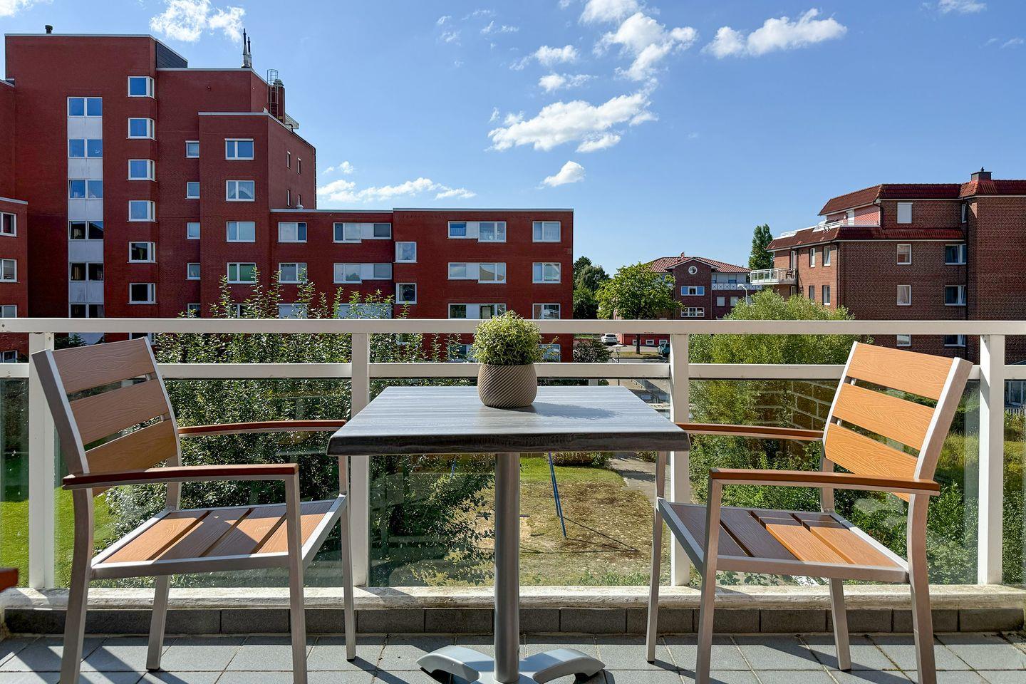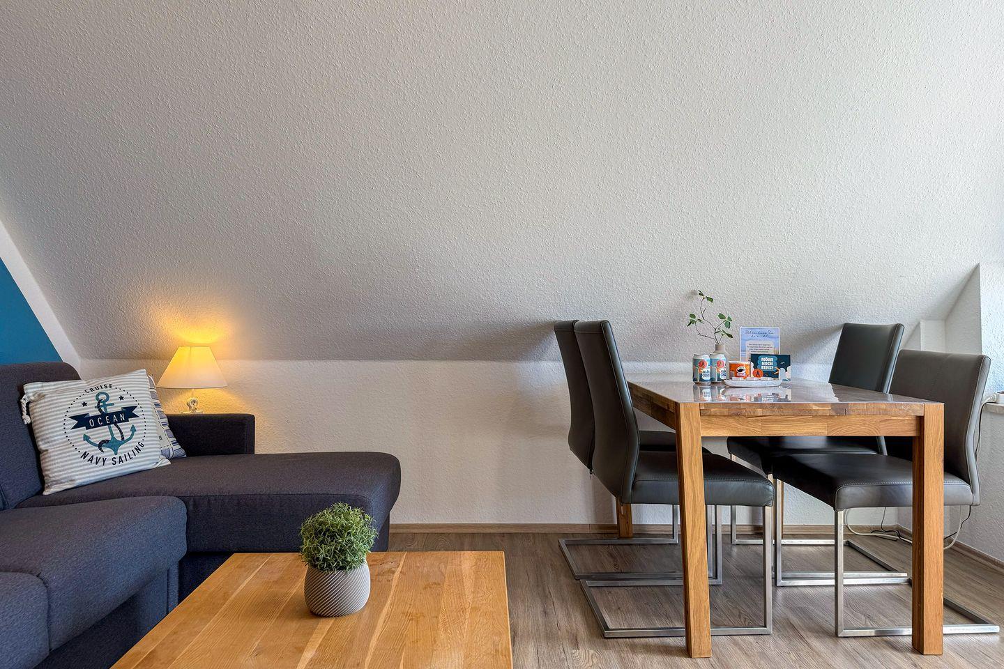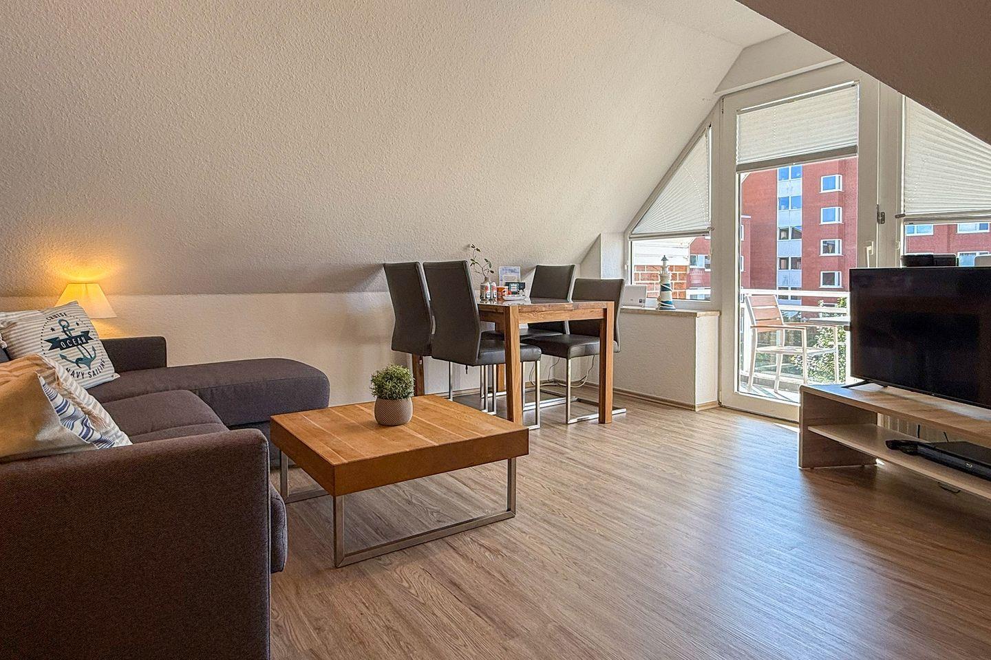 Mit einer Wohnfläche von ca. 40 m² eignet sich die Ferienwohnung für bis zu vier Personen. Das Raumkonzept ist offen und zeitgemäß gestaltet: Das Wohnzimmer mit bequemer Sofaecke (Schlafsofa 120 cm x 200 cm Liegefläche) schließt direkt an den Essbereich und die offen zum Wohnraum angeordnete Küche an. Der überdachte Balkon ist ein weiteres Highlight – hier können Sie unabhängig vom Wetter entspannen und die frische Nordseeluft genießen. Ein weiterer Balkon ist vom Schlafzimmer aus zugänglich.