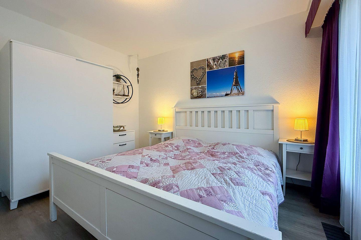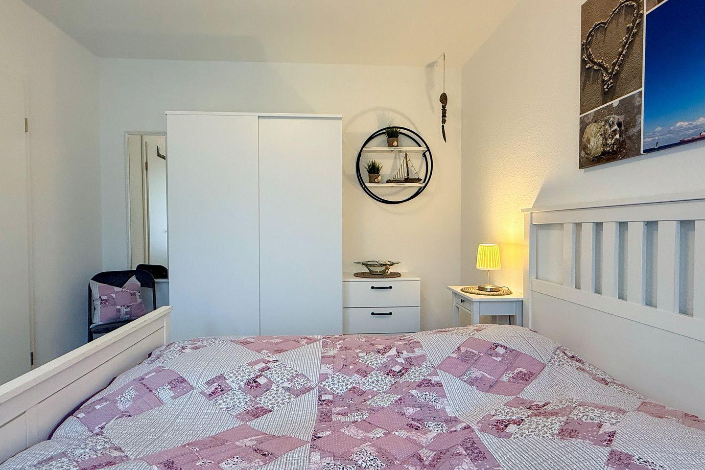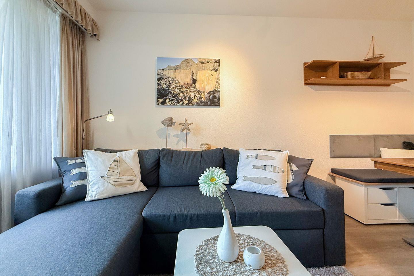 Mit einer Wohnfläche von ca. 45 m² ist die Ferienwohnung auf die Ansprüche von bis zu zwei Personen ausgelegt. Das separate Schlafzimmer sorgt für erholsame Nächte, während das Wohnzimmer mit gemütlichem Sofa den idealen Ort für entspannte Abende bietet. Große Fenster mit Sichtschutz schaffen eine angenehme Wohnatmosphäre bei optimaler Privatsphäre.