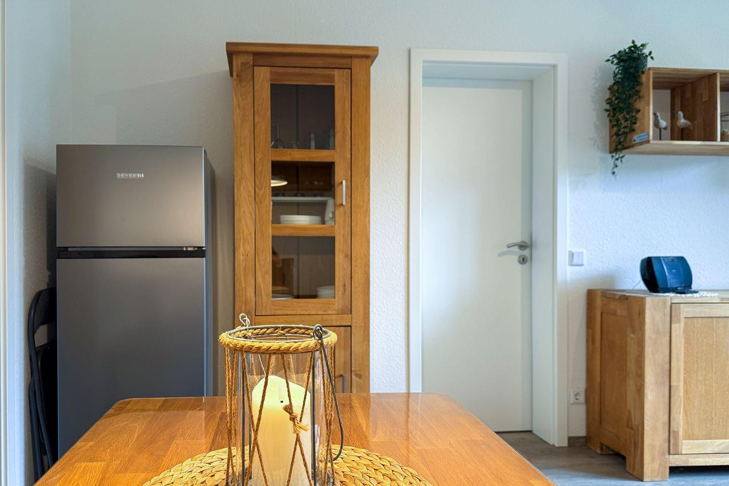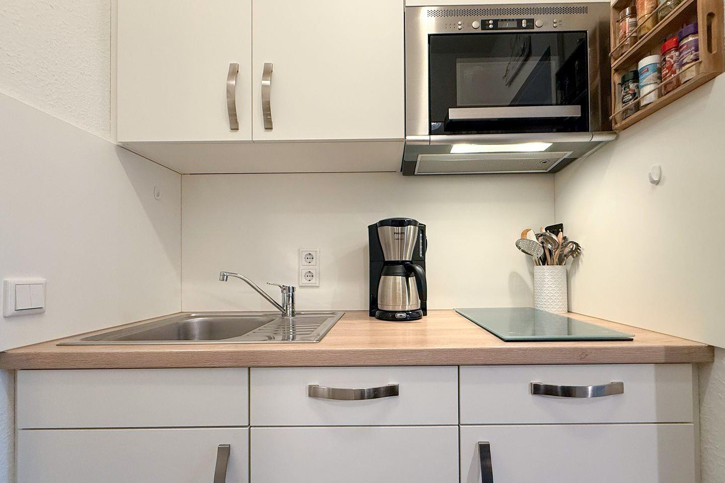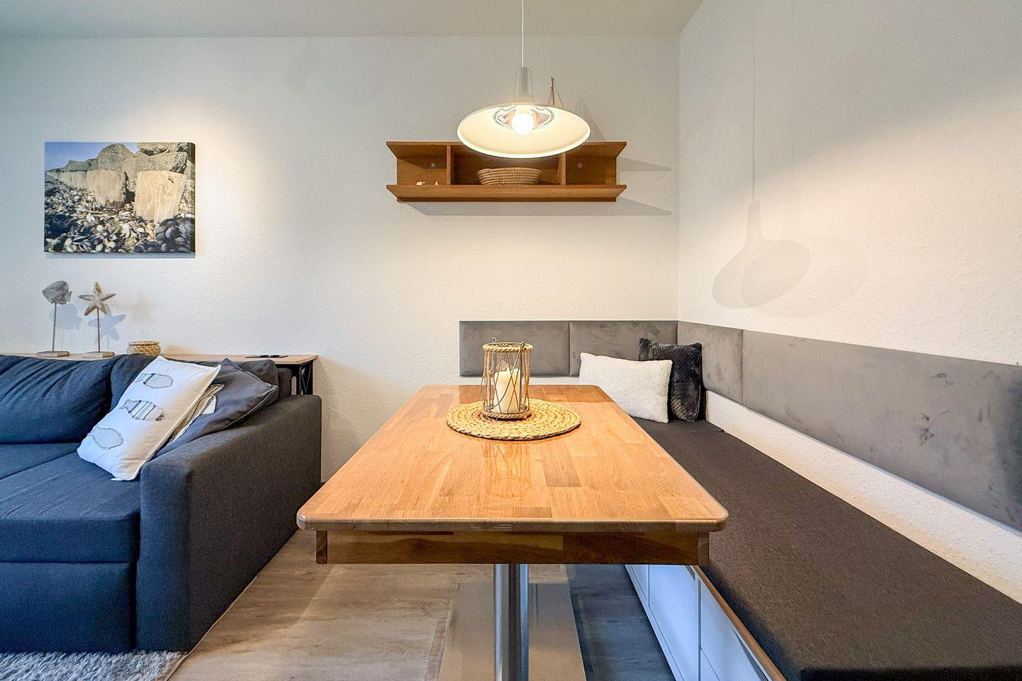 Der Essbereich ist offen zur modernen Kochnische gestaltet und umfassend ausgestattet: Neben einem 2-Platten-Herd stehen Ihnen ein kombiniertes Backofen-/Mikrowellengerät, eine Spülmaschine, ein Kühlschrank mit integriertem Gefrierfach sowie zahlreiche Küchenutensilien, Geschirr und Besteck zur Verfügung. Kaffeemaschine, Toaster und Wasserkocher ergänzen das Angebot für unbeschwerte Selbstverpflegung.