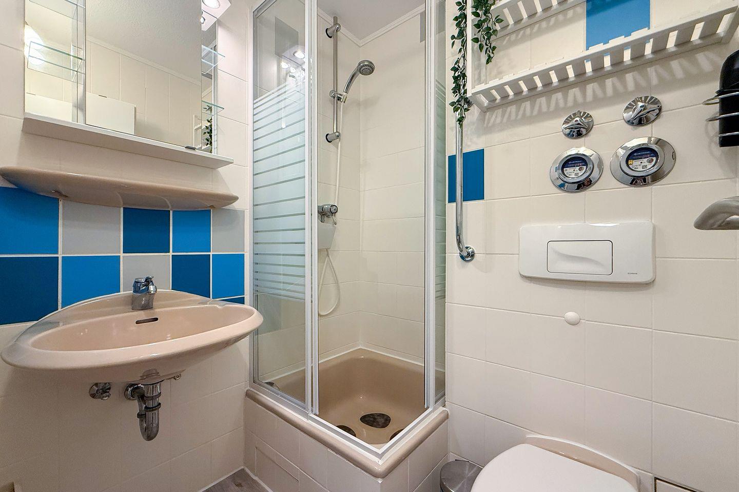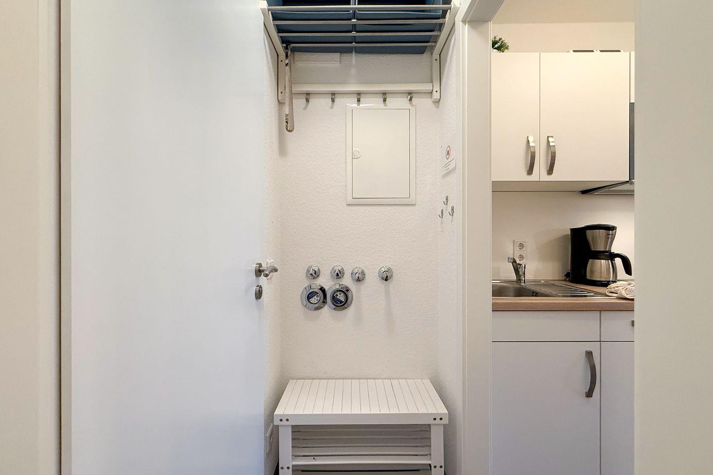 Das Badezimmer ist mit einer Dusche, WC, Haartrockner und Spiegel ausgestattet. Ein Ganzkörperspiegel ist ebenfalls vorhanden, sodass Sie sich rundum wohlfühlen können. Für hygienische Bedürfnisse stehen Ihnen gemeinschaftlich nutzbare Waschmaschinen und Trockner bereit.