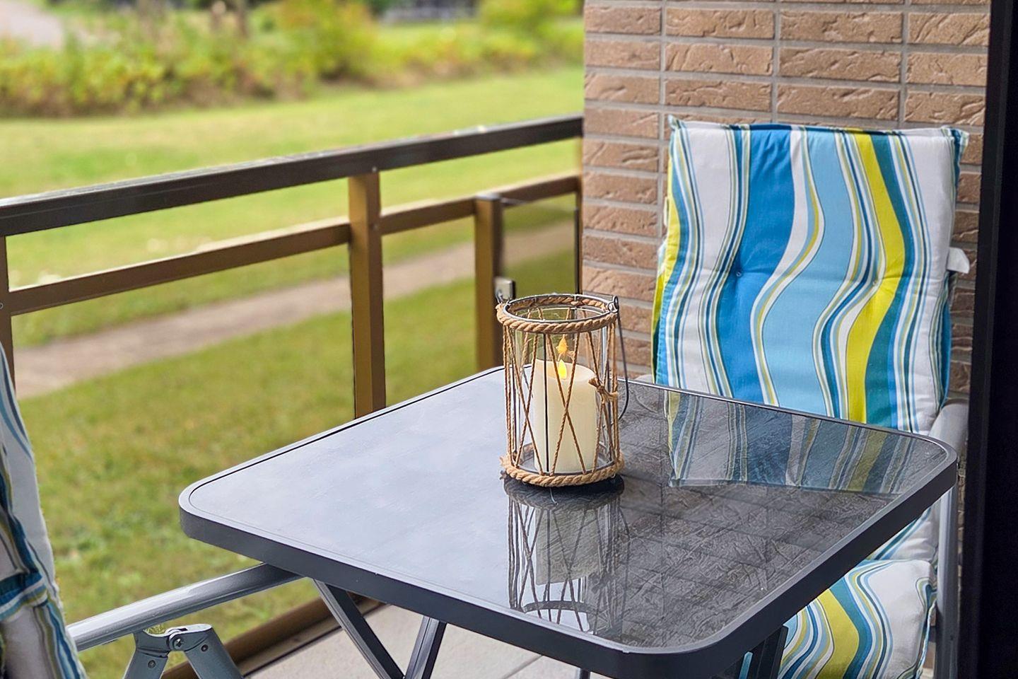 Der überdachte Balkon bietet sowohl bei Sonnenschein als auch bei wechselhaftem Wetter einen geschützten Platz im Freien. Hier können Sie das Meeresklima genießen oder nach einer ausgedehnten Strandwanderung zur Ruhe kommen. Für zusätzlichen Komfort steht Ihnen ein Sonnenschirm zur Verfügung.