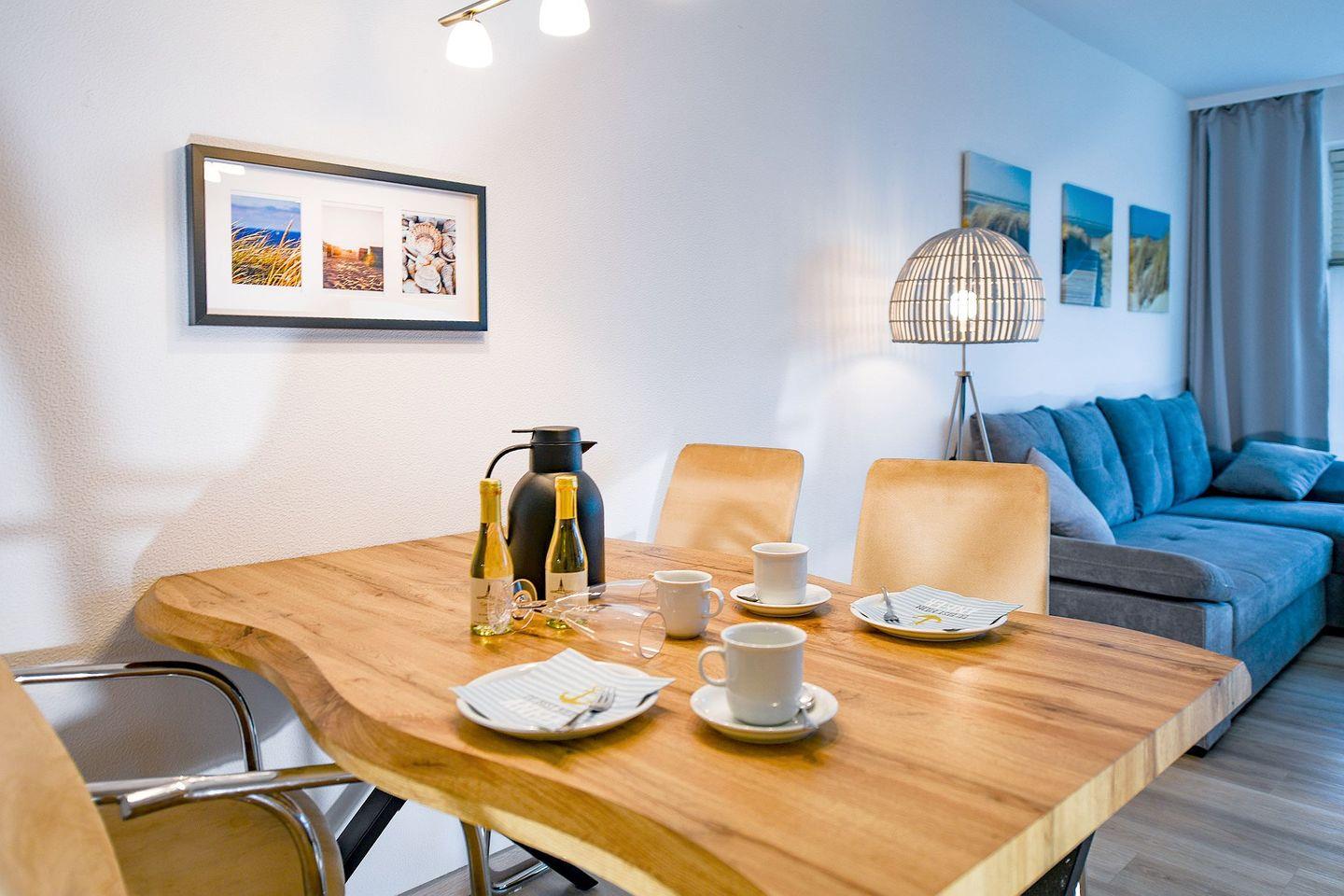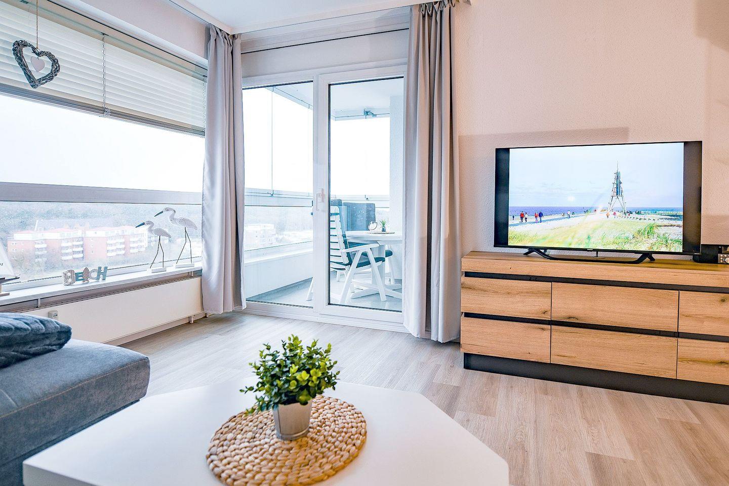 Ein Highlight ist der verglaste Südbalkon mit Seesicht, der sich komplett öffnen lässt. So genießt du Sonne, frische Nordseeluft und einen weiten Blick – bei jedem Wetter.