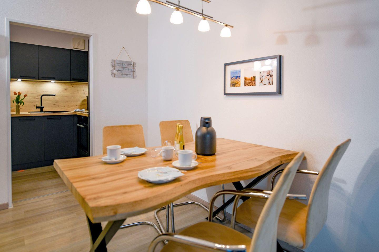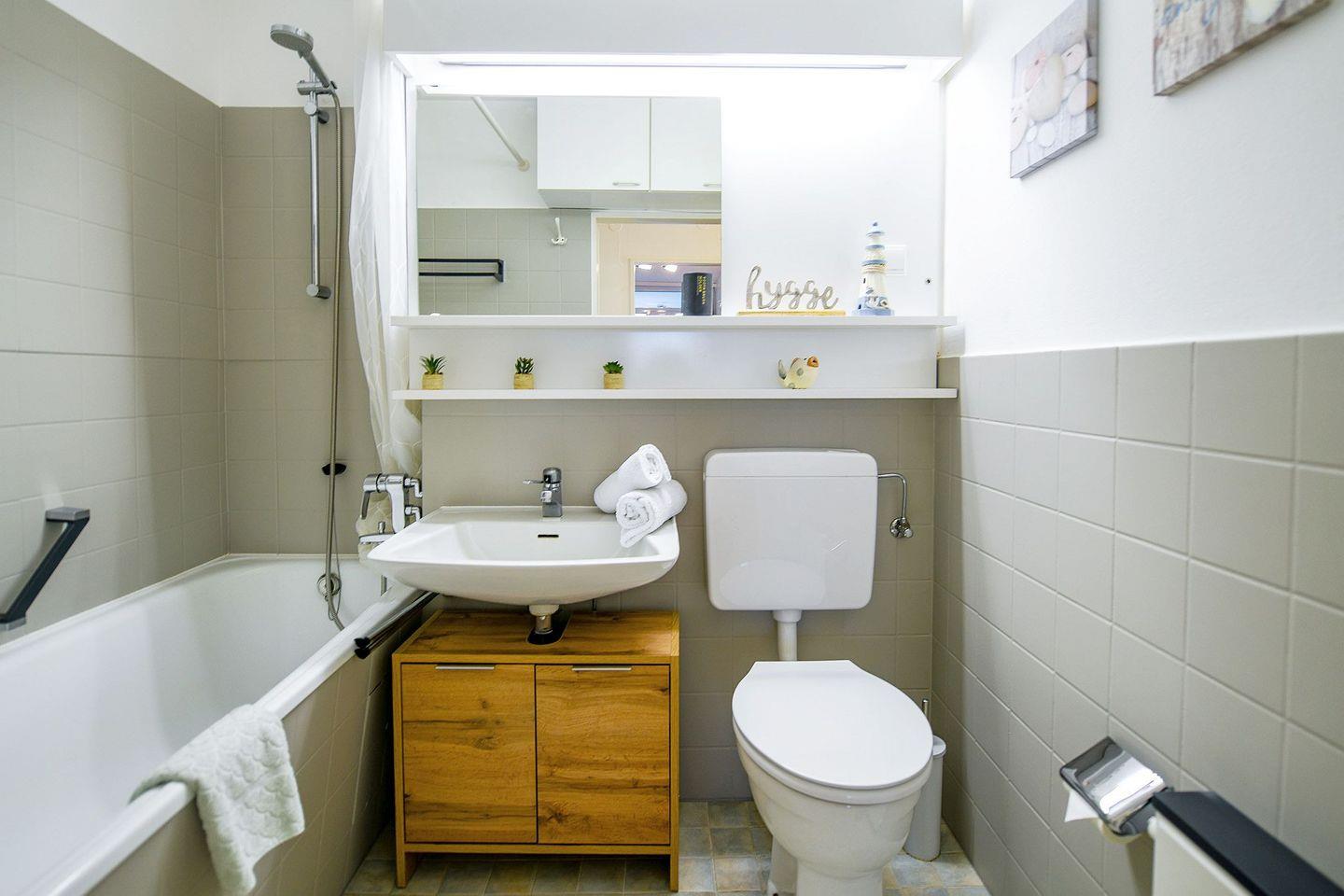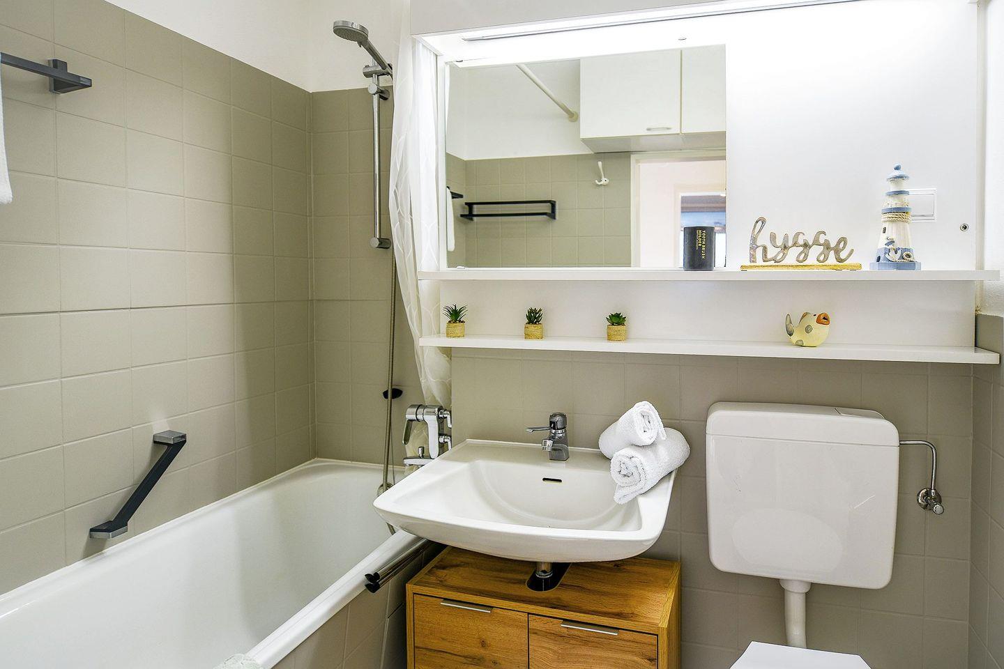 Die helle Wohnung bietet ein gemütliches Wohnzimmer, ein separates Schlafzimmer sowie eine voll ausgestattete Küche. Das Bad verfügt über eine Badewanne – perfekt zum Entspannen nach einem Tag am Meer.