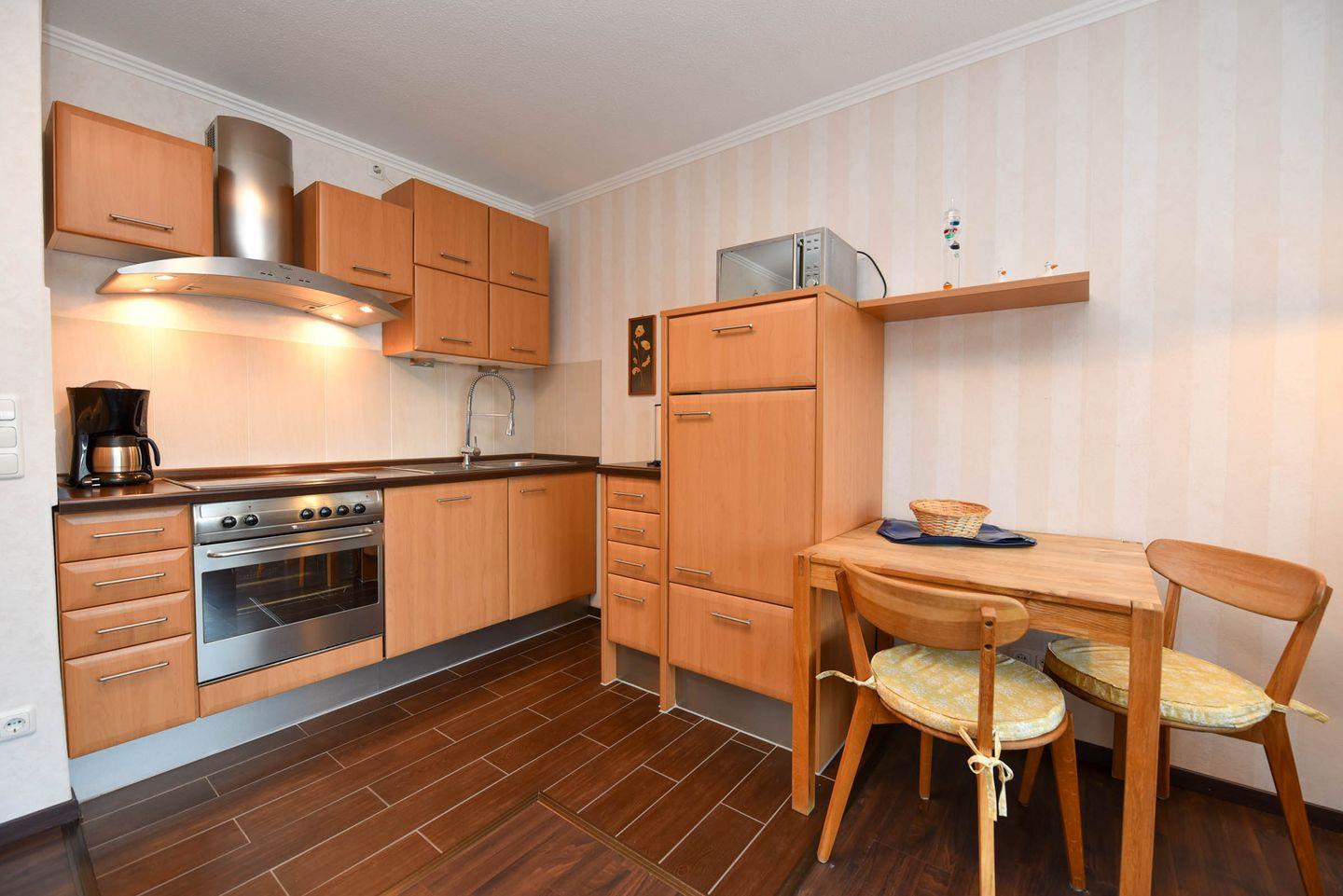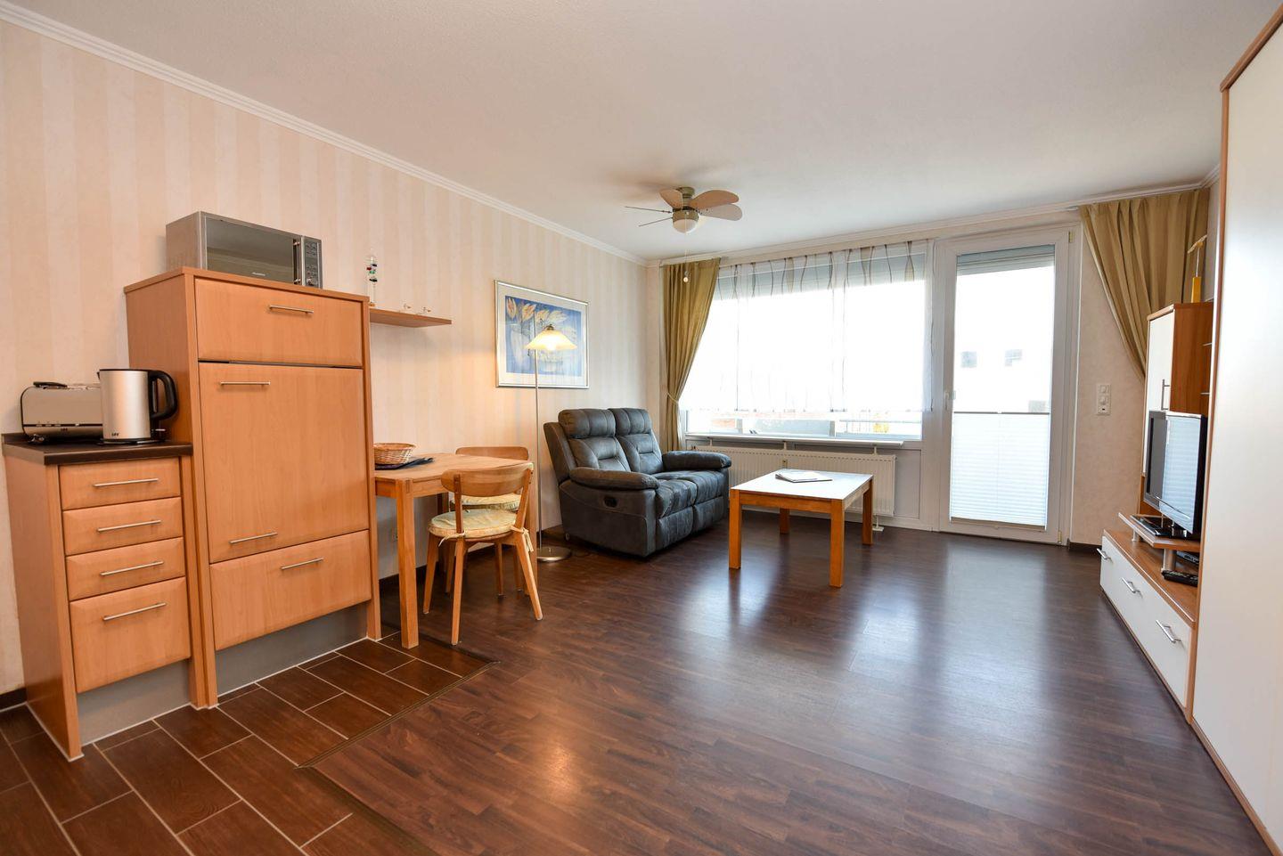 Der kombinierte Wohn- und Schlafbereich ist mit einem komfortablen Schrankklappbett ausgestattet und ideal für 2 Personen. Eine gut ausgestattete Küchenzeile mit Kühlschrank, Spülmaschine, Mikrowelle, Elektrokochfeld, Kaffeemaschine, Wasserkocher und ausreichend Geschirr ermöglicht die Selbstversorgung. Das moderne Duschbad rundet die Ausstattung ab.