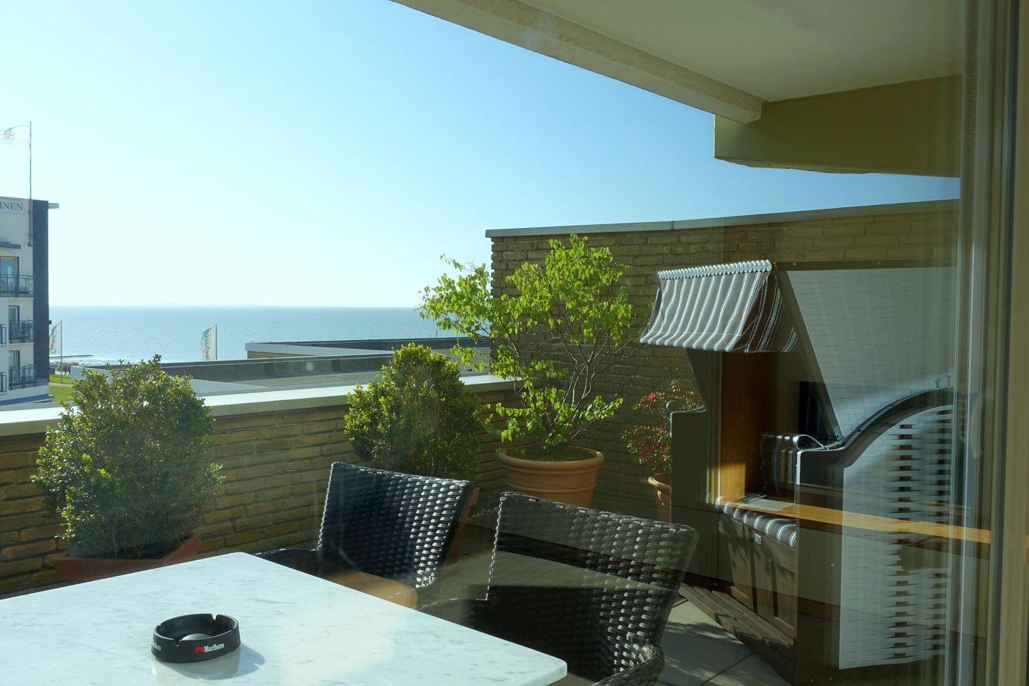 Die Panorama-Wohnung 47 im 3. Obergeschoss liegt in erster Reihe an der Duhner Strandstraße 2 in Cuxhaven-Duhnen und bietet auf 63 m² Wohnfläche ein komfortables Ambiente für erholsame Tage am Meer. Der Sandstrand und die Promenade befinden sich direkt vor der Tür. Von der überdachten Terrasse mit Strandkorb genießen Sie einen eingeschränkten Meer- und Strandblick – ideal zu jeder Tageszeit.